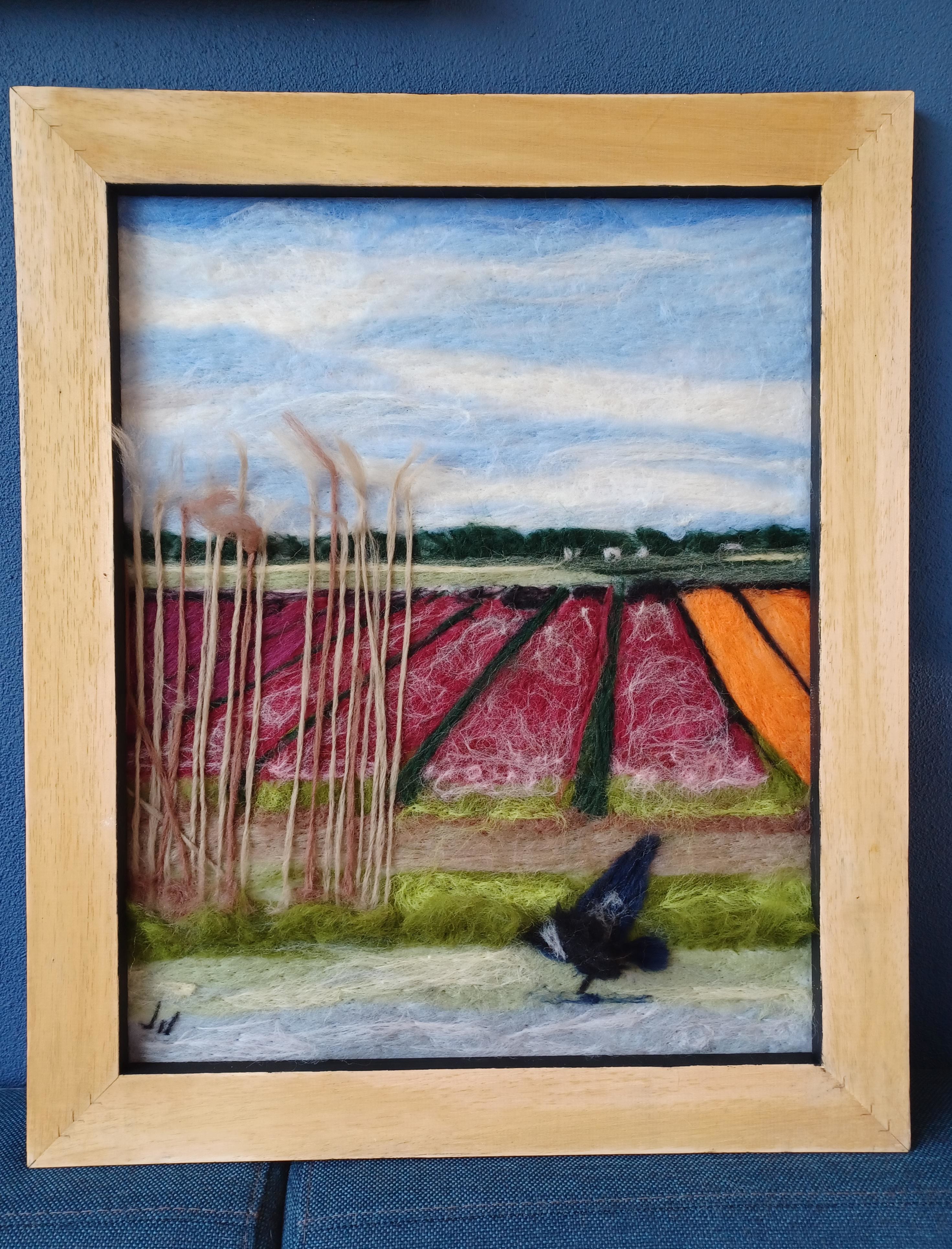 de bloembollen velden met in de voorgrond een grote vogel Gemaakt met naaldvilting