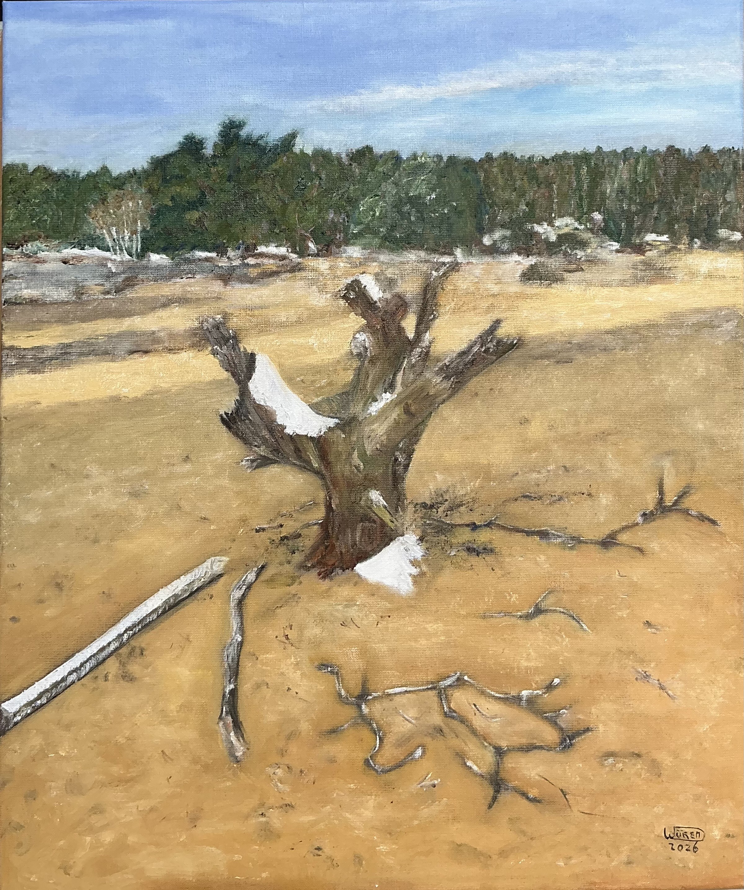 Ik heb niet echt een atelier; ik noem het “mijn hok”. Het is wel de plek waar ik schilder, waar de verf op het doek komt. Maar het echte atelier zit in mijn hoofd. Daar ontstaan de ideeën, de kleuren. Daar worden de keuzes gemaakt. Dat wordt allemaal gevoed door de omgeving, door de indrukken die ik opdoet. Veel van mijn inspiratie haal ik uit de natuur. Vandaar dit landschap als “Mijn Atelier”.