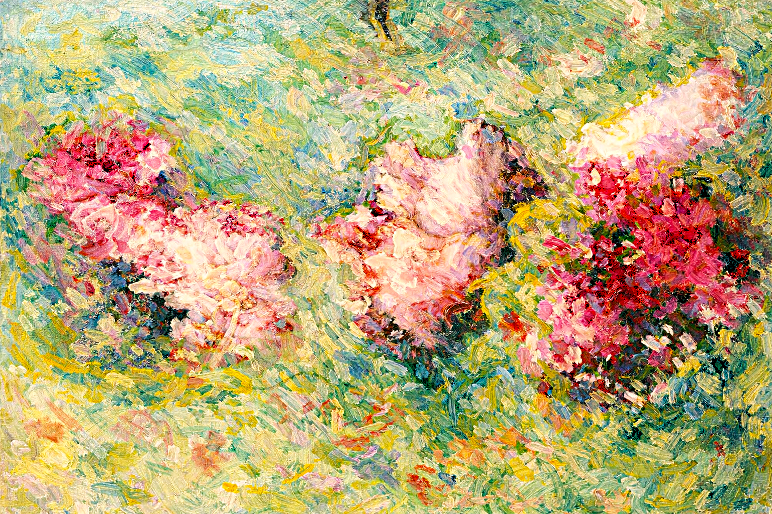 Deze pastelachtige Morisot variant lijkt te ademen in licht - een schilderij dat niet beschrijft, maar herinnert. De bloemen zijn geen objecten meer, maar momenten van kleur: roze, wit en blauw die oplossen in een zachte atmosfeer. De penseelstreek is vluchtig, alsof de hand van de schilder het licht probeert te vangen voordat het verdwijnt.