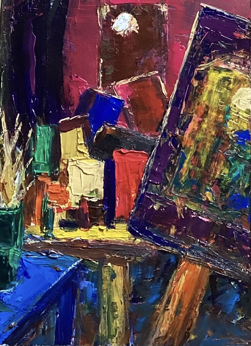 Chaos en veel kleuren. Met paletmes en grof penseel.