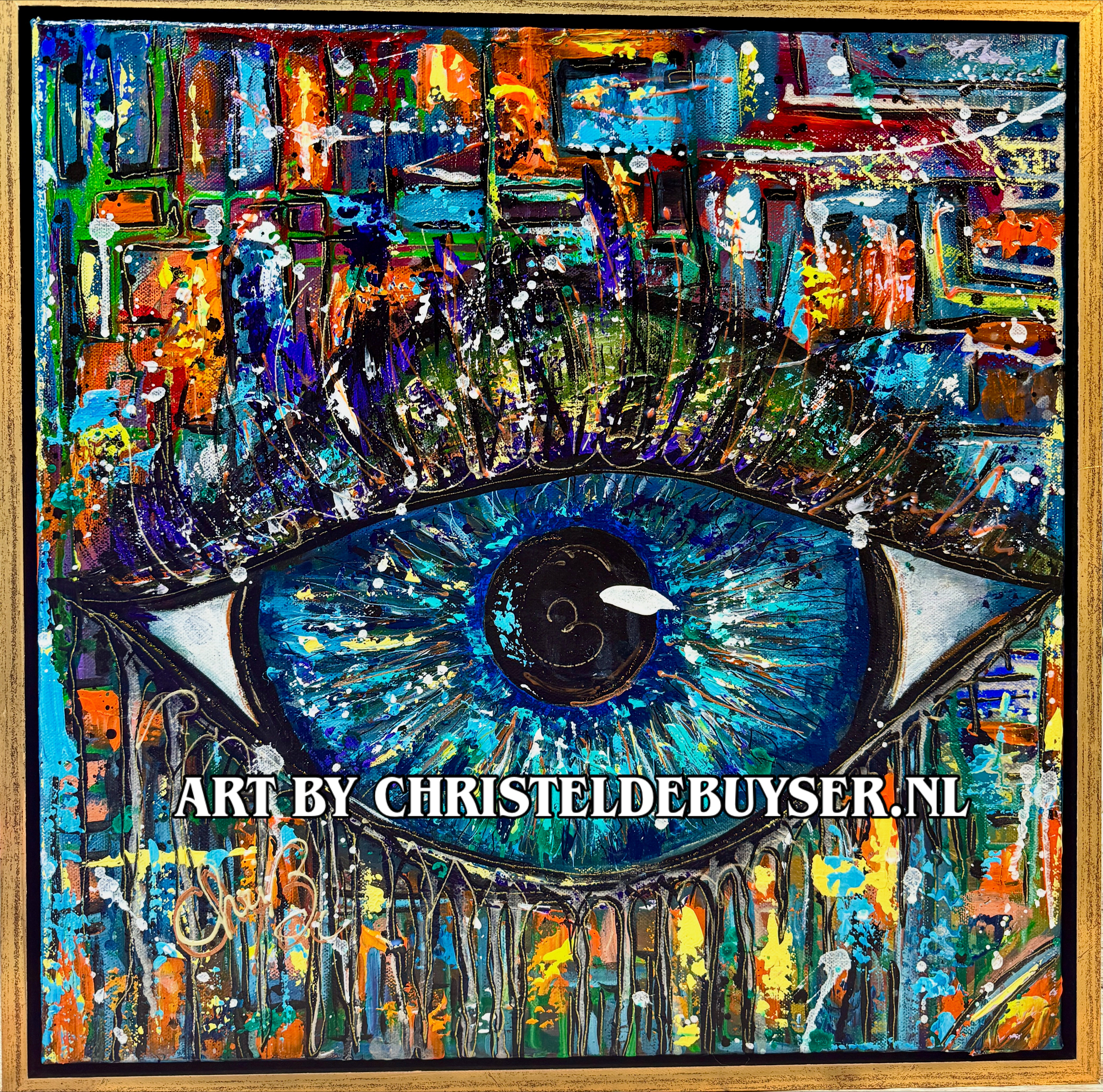 “Net Als Je Dacht Alles Gezien Te Hebben” is een overweldigend, stads-achtig energie-oog dat je in één klap terug recht in je eigen bewustzijn trekt. De iris — een kolkende mix van turquoise, oceaanblauw, kobalt en elektrische geelaccenten — straalt als een kosmische poort. De pupil lijkt een zwart gat waarin een hele wereld kan verdwijnen of juist geboren kan worden. Dikke verfstrepen, krassen, drips en spetters creëren een ritme alsof het leven zelf door de muur heen dendert. Het is een werk dat zegt: Je dacht dat je al gekeken had. Maar dit oog ziet verder. Verder dan kleur, verder dan vorm —recht in het onzichtbare. Ingelijst in gouden lijst