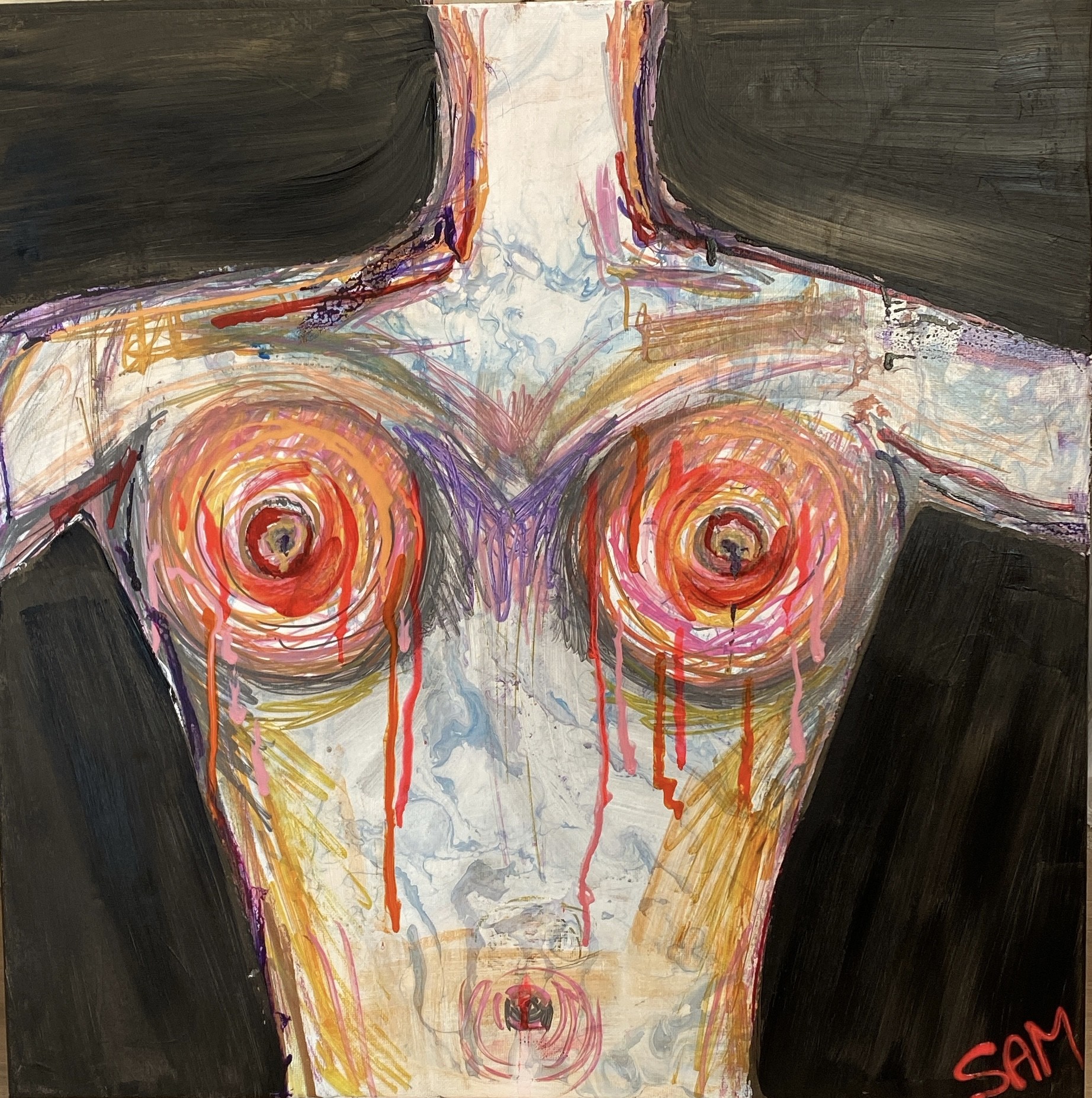 Dit werk heb ik gemaakt na een programma op tv waarin de vrouwen super rijk zijn en zich volledig laten verbouwen en zichzelf lelijker maken en zo ontevreden zijn vandaar dit statement met dit schilderij