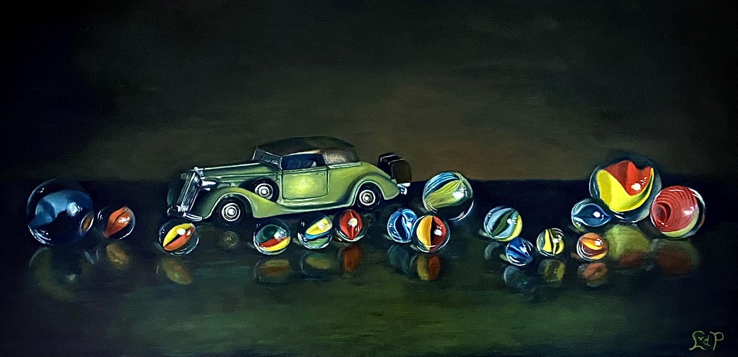 Kijken met kinderogen. Een nostalgische scène waarin de tijd lijkt stil te staan — een vintage speelgoedauto omringd door kleurrijke knikkers, waarvan de reflecties glinsteren in het zachte licht. Het schilderij roept de onschuld en verwondering van de kindertijd op, toen de verbeelding kleine voorwerpen veranderde in grootse avonturen. Door het spel van kleur en licht nodigt het werk de kijker uit om opnieuw met kinderlijke ogen te kijken — waar vreugde eenvoudig is en elk moment magie bevat.