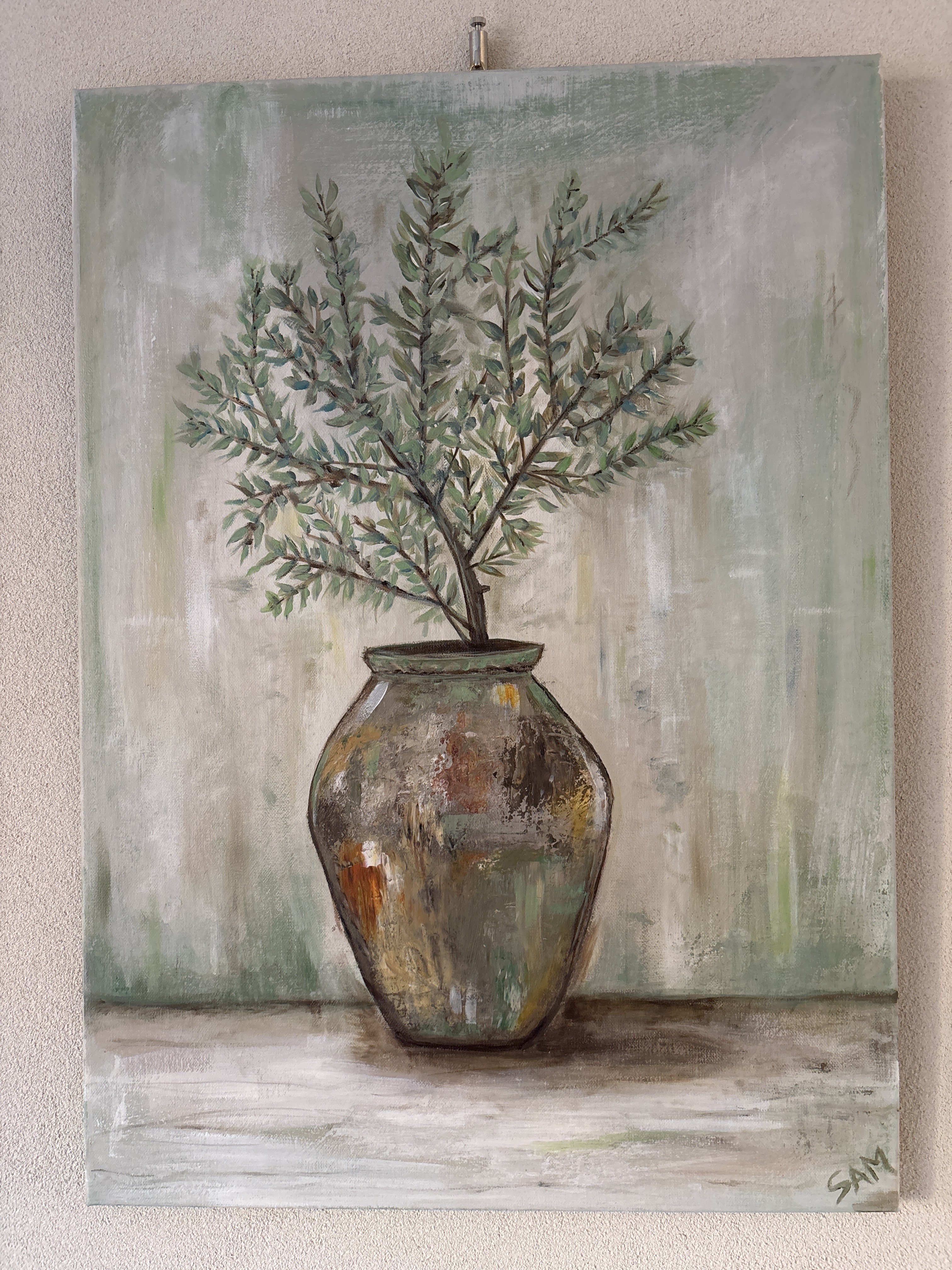 Dit werk met plezier gemaakt doet me denken aan Italië mijn favoriete land. De pot bewust oud laten lijken ben dol op de kleuren jaar geleden gemaakt en zou nu nog wat meer diepte en licht gebruiken.
