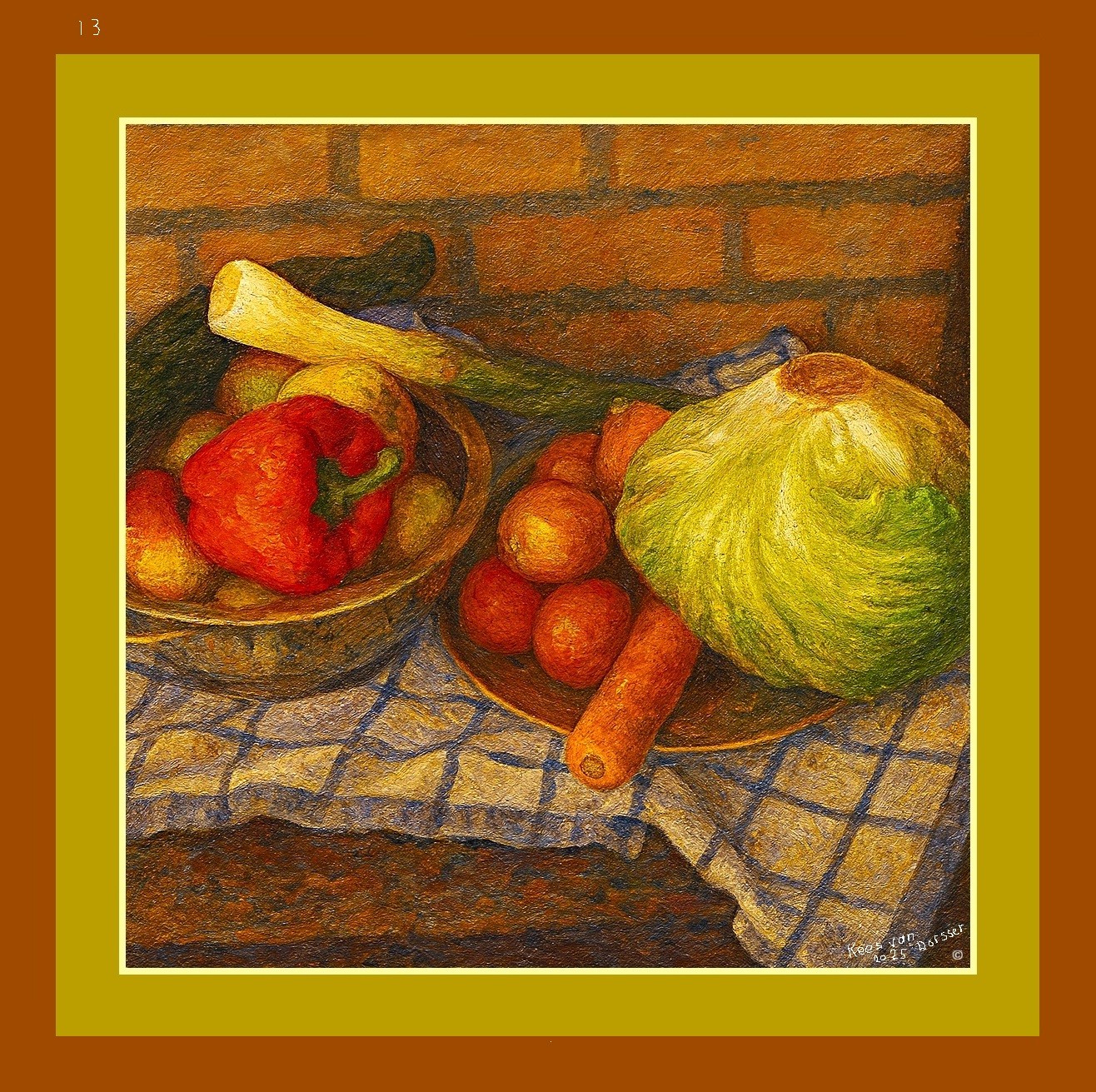 De metalen kommen glanzen zacht, gevuld met tomaten, appels, paprika, prei, sla en wortel-alsof ze net geoogst zijn uit een tuin van herinnering. De blauw-witte ruit van het kleed draagt het geheel als een tafel voor het seizoen, en de bakstenen muur op de achtergrond geeft het werk een aardse, huidelijke rust.