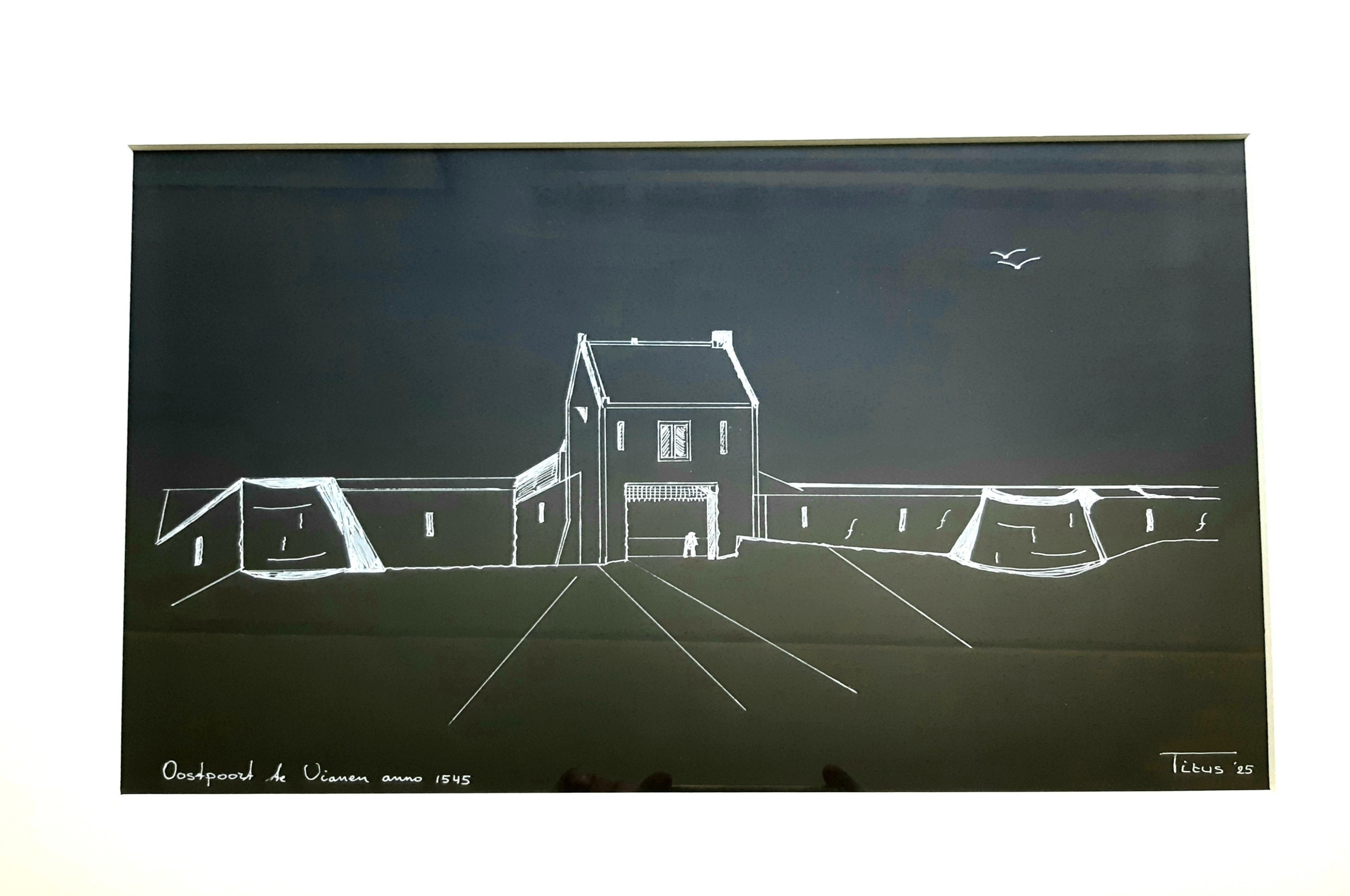 De Oostpoort is in de 19de eeuw afgebroken. Op basis van historisch onderzoek wordt de imaginaire Oostpoort nieuw leven ingeblazen. U staat binnen de stadsmuren en u kijkt van west naar oost. Witte inkt op zwart papier. Is bestemd voor de expo in de Grote Kerk te Vianen (vanaf 14 oktober 2025)