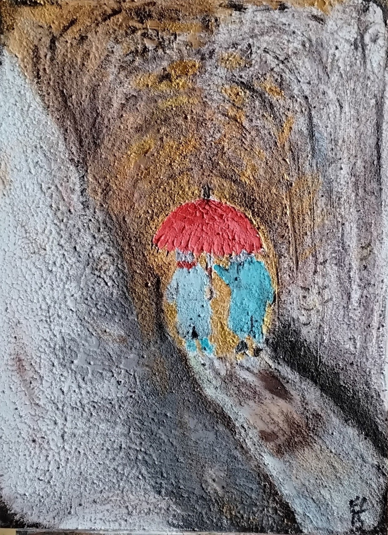 Het geheel is opgezet met gesso gemengd met vogelzand en de afbeelding voegde zich zelf. Met een oud stel als middelpunt op weg naar t licht