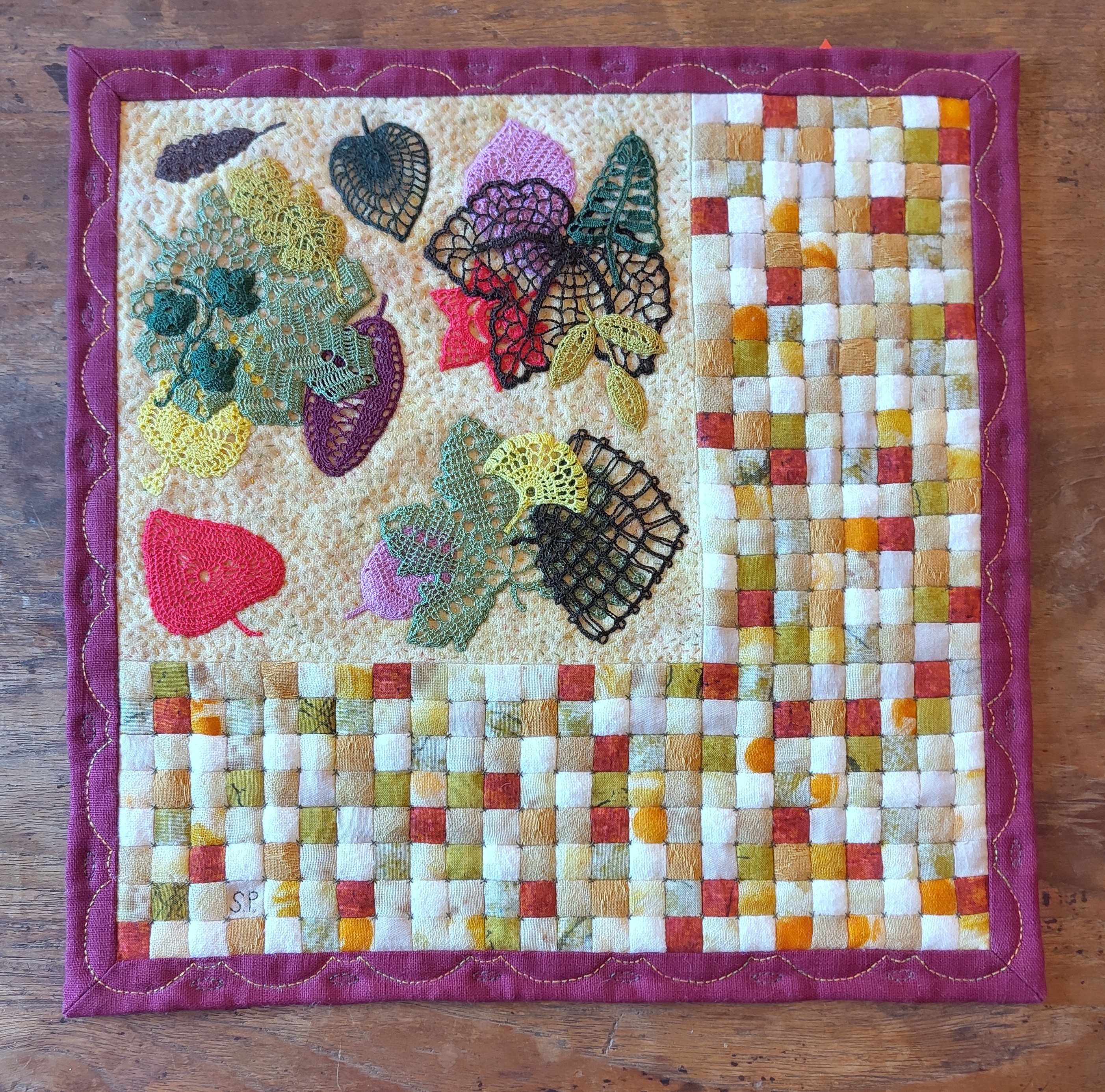 Een wandkleed vol kleuren uit de oogsttijd, de late zomer en vroege herfst. Het palet is geïnspireerd door de manden vol sierkalebassen die in mijn kindertijd het teken van van deze tijd van het jaar. De gevallen bladeren, die voor veel mensen eerder vervelend zijn dan mooi, worden in dit werk juist wél tentoongesteld in al hun kleurrijke variëteit. Patchwork en quilting met gehaakte applique. Dit werk bevat wollen, katoenen en linnen stof en katoenen, zijde en polyester draden. Aan de achterkan is een ophanglat bevestigd die gemakkelijk verwijderd kan worden voor transport of schoonmaak. Dit werk blijft het langste mooi als het opgehangen wordt op een plek waar het weinig direct zonlicht krijgt. Stof kan gemakkelijk verwijderd met een kledingroller en het werk kan indien nodig met de hand gewassen worden in koud water met een handwasmiddel geschikt voor wol.