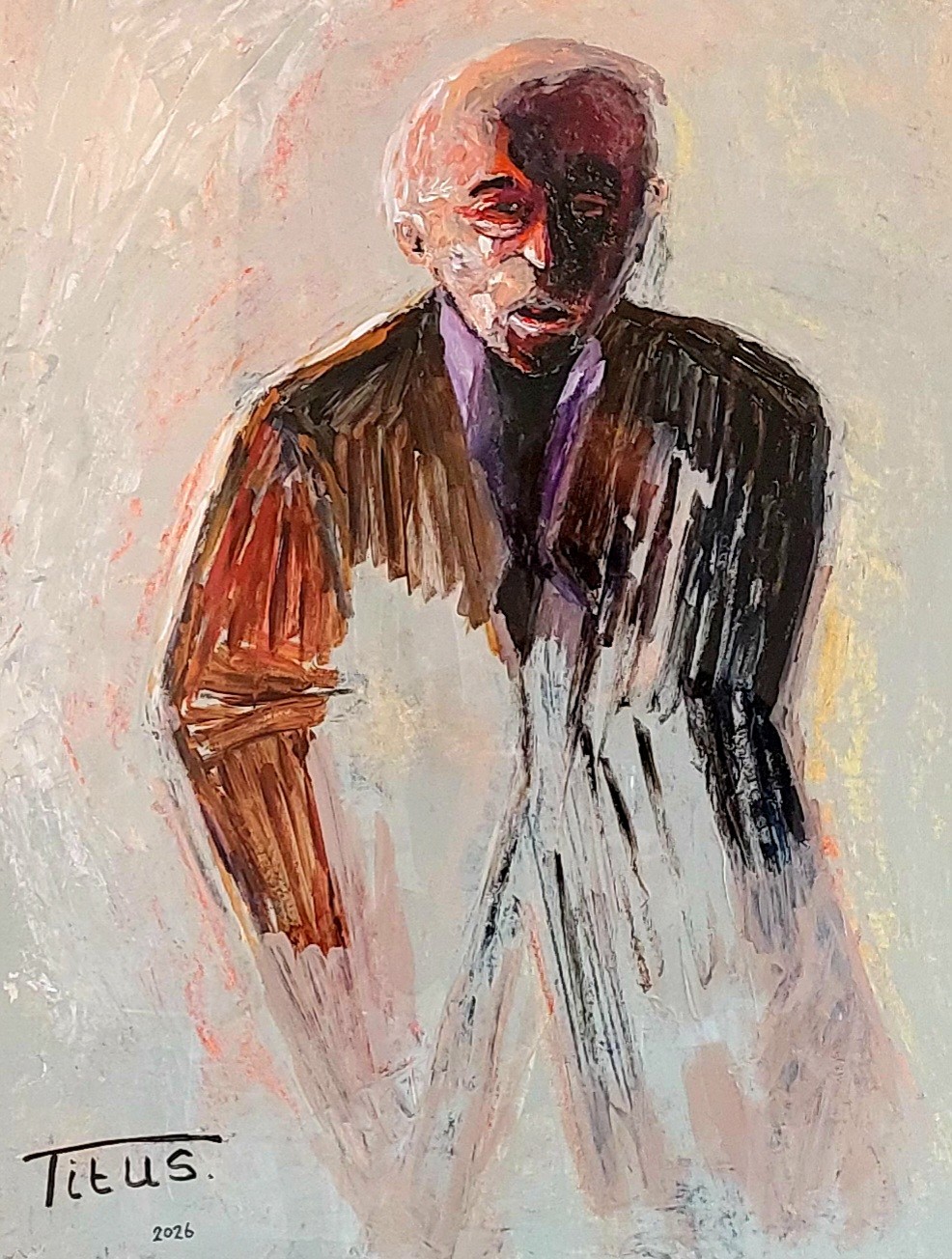 Lopend over de Voorstraat in Vianen zie ik een oudere man lopen. Een echte Vianees, weet ik. Hij gaat even zitten op een van de bankjes die op de Voorstraat staan. Ik maak snel een schets en doe thuis de rest. Impressionisme ten top.