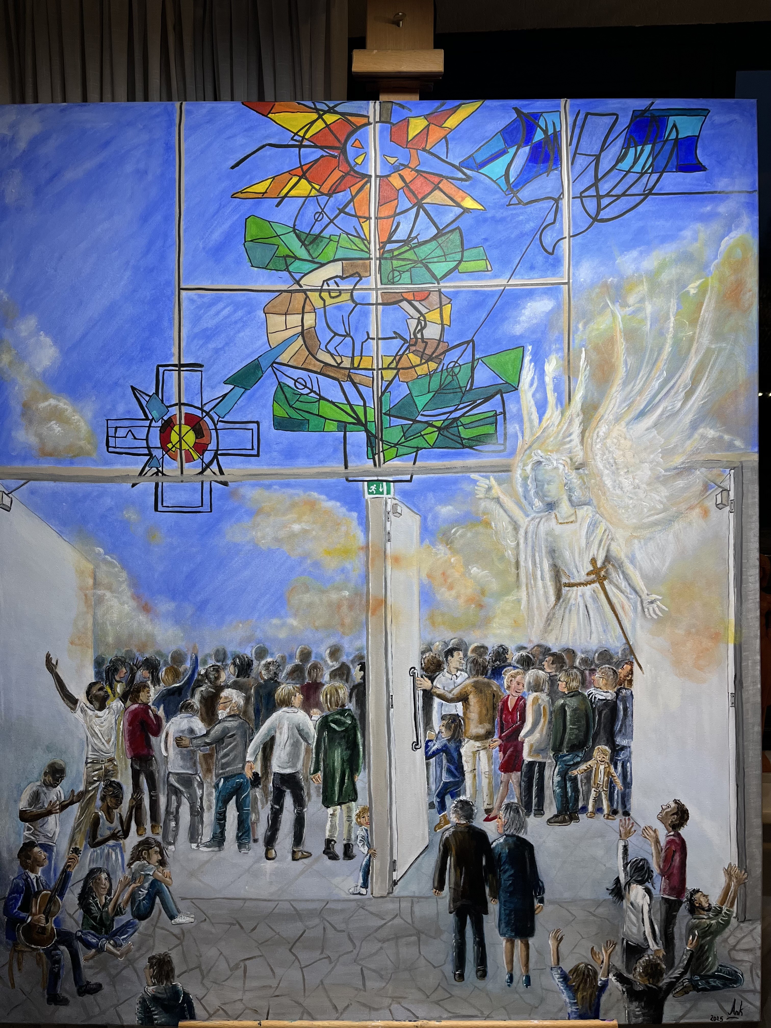 Outreach Het gaat over “ beeld” dat ik kreeg, over vol zijn en dat het bovennatuurlijke ook normaal is. Het gaat over uitdelen, naar buiten gaan, niet alles voor je zelf houden. Daarom wijst die engel ( die ik in dat beeld zag) ook naar buiten. N.a.v. Johannes 20 :21 HTB “ Ik wens jullie vrede, zei Jezus weer. Zoals de Vader Mij heeft uitgezonden, zo zend Ik jullie uit!” Kerk zijn zonder muren.