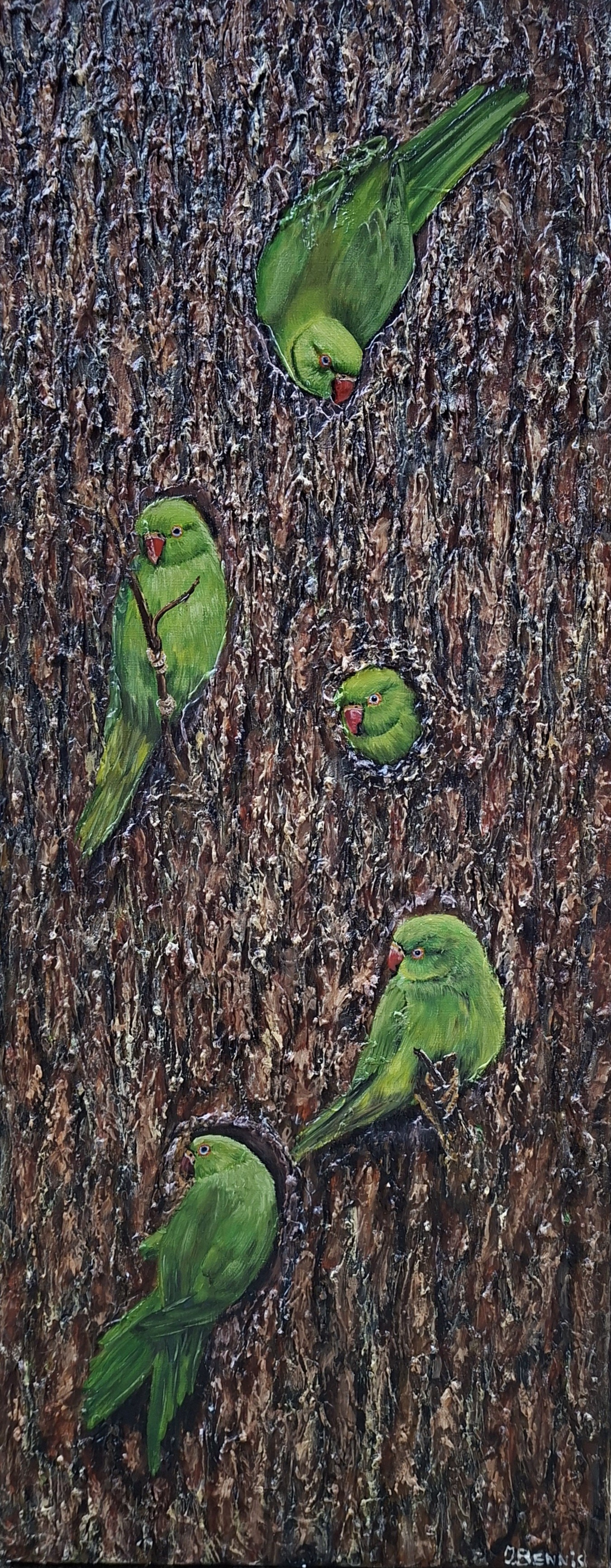 Parrots, acryl en olieverf.