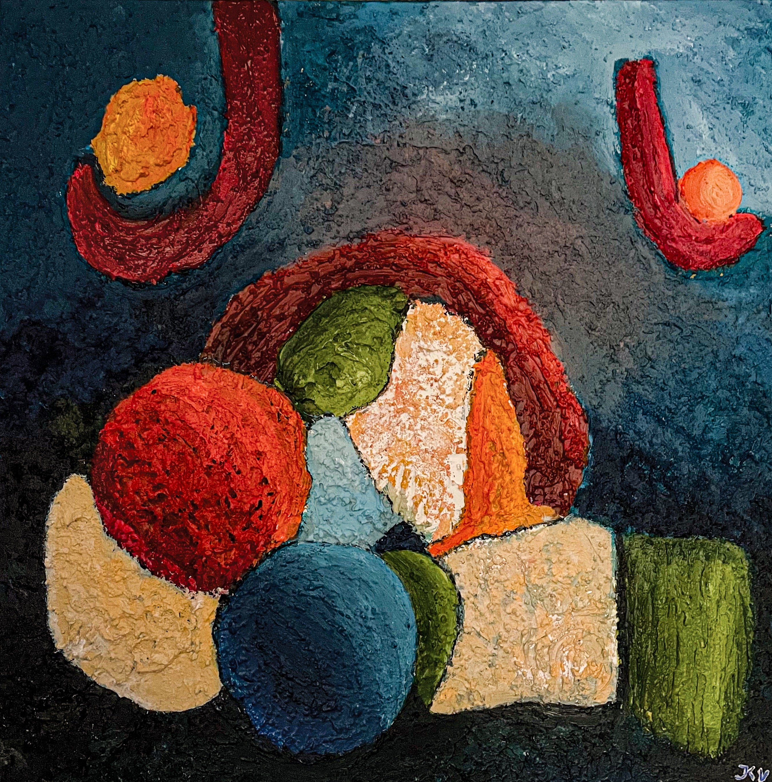 Dit grote reliefrijke 3D doek ademt warmte. De kleuren en vormen zijn de metafoor voor aspecten van geluk. In het doek is veel pasta verwerkt met allerlei steentjes. De acrylkleuren bevatten veel pigment.