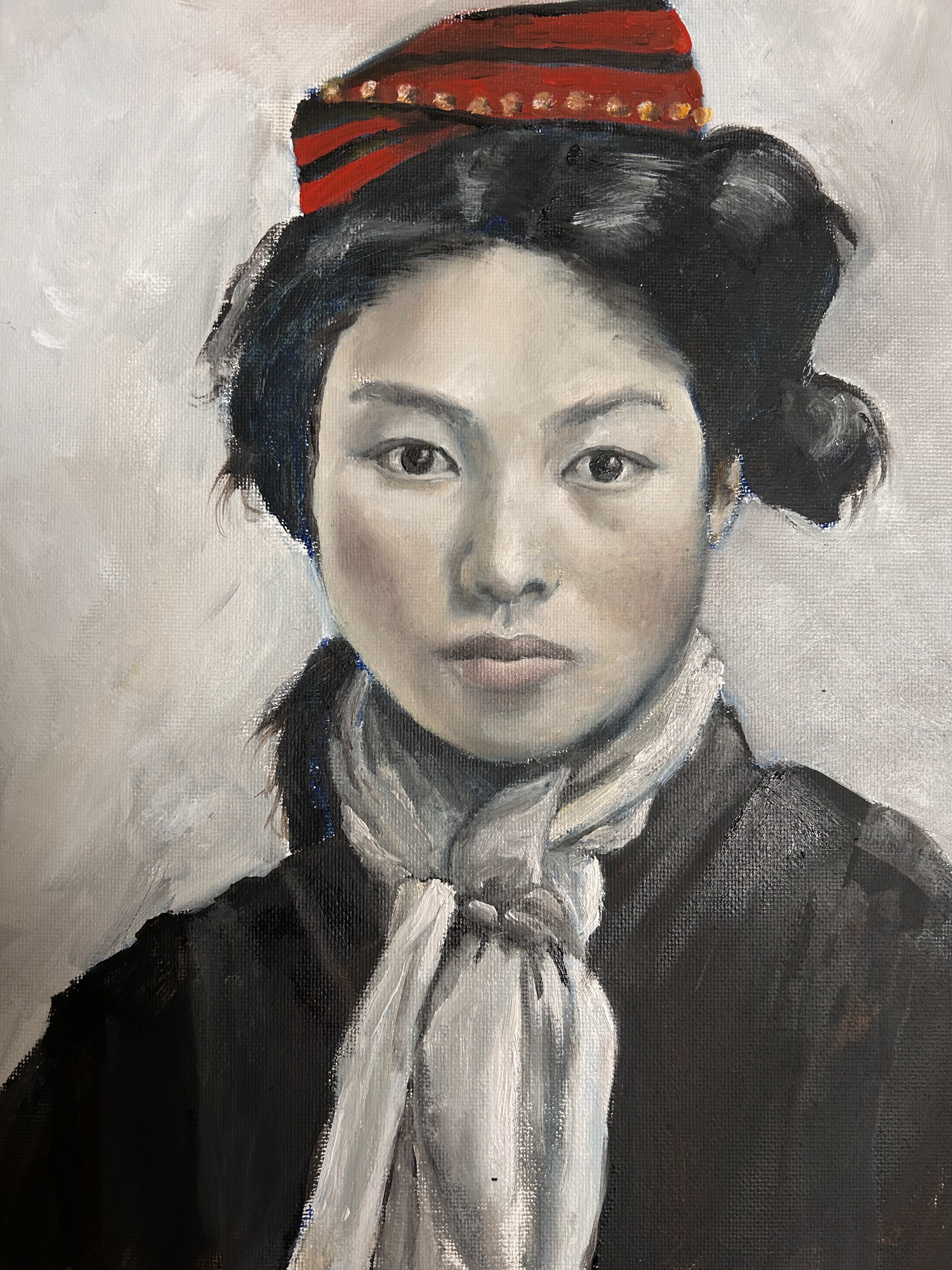portret van een japanse vrouw met rood-zwarte pill, olieverf
