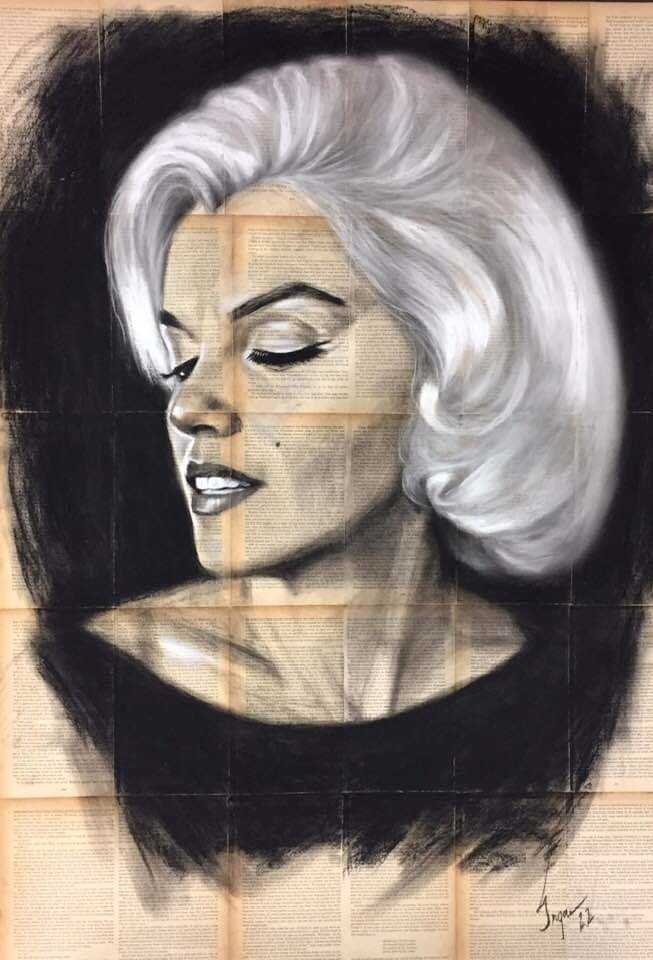 Portret van Marilyn Monroe, uitgevoerd in pastel op gelijmde boekpagina’s. Het werk is geëxposeerd in het Museum voor Hedendaagse Kunst WG Kunst, Amsterdam.