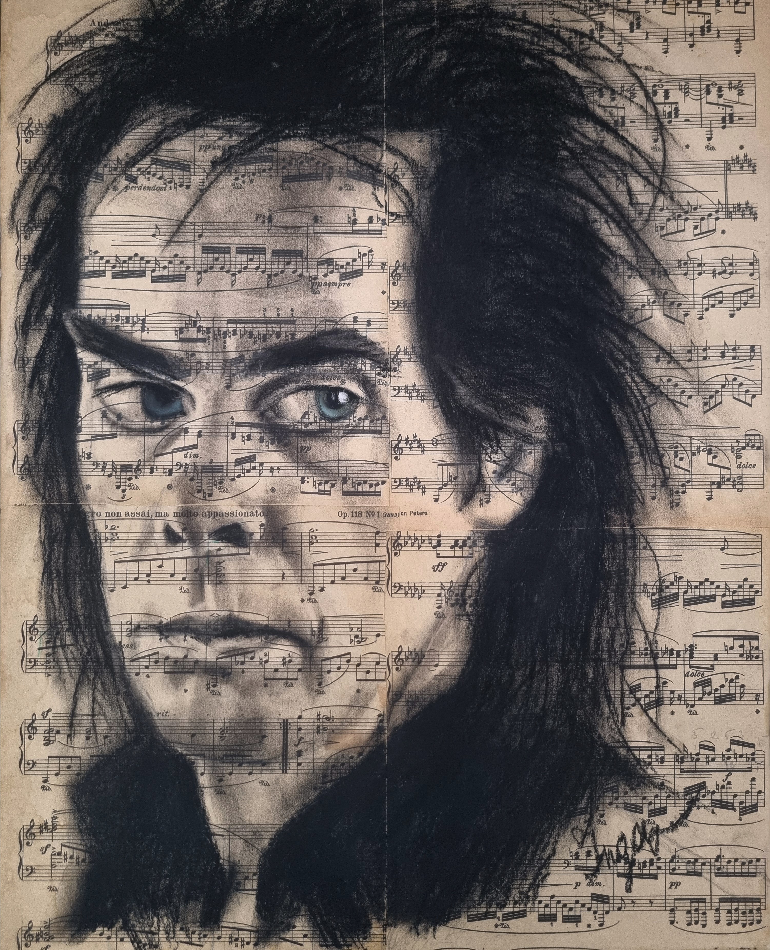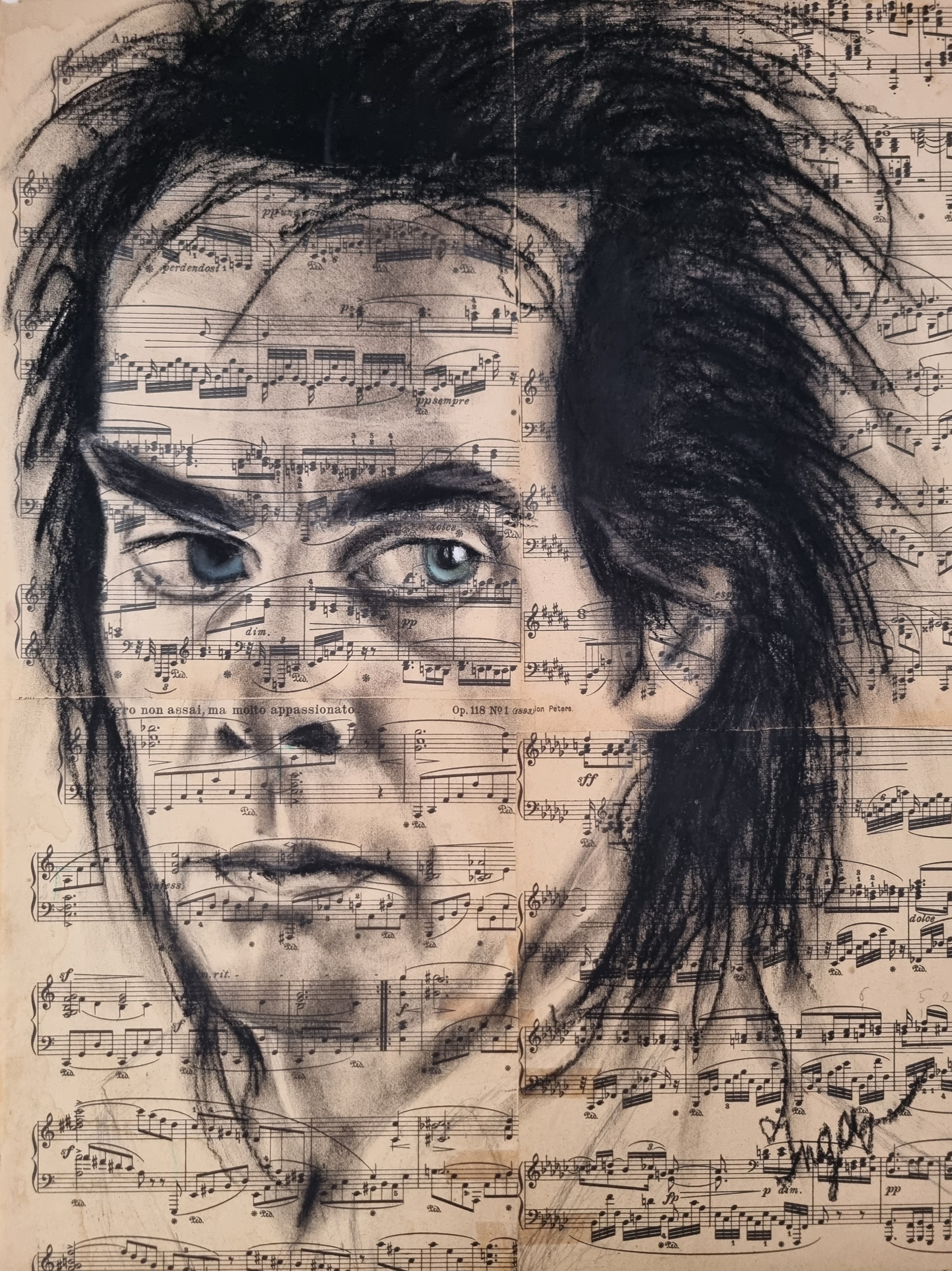 Pastel op bladzijden uit een muziekboek, aangebracht op doek op spieraam