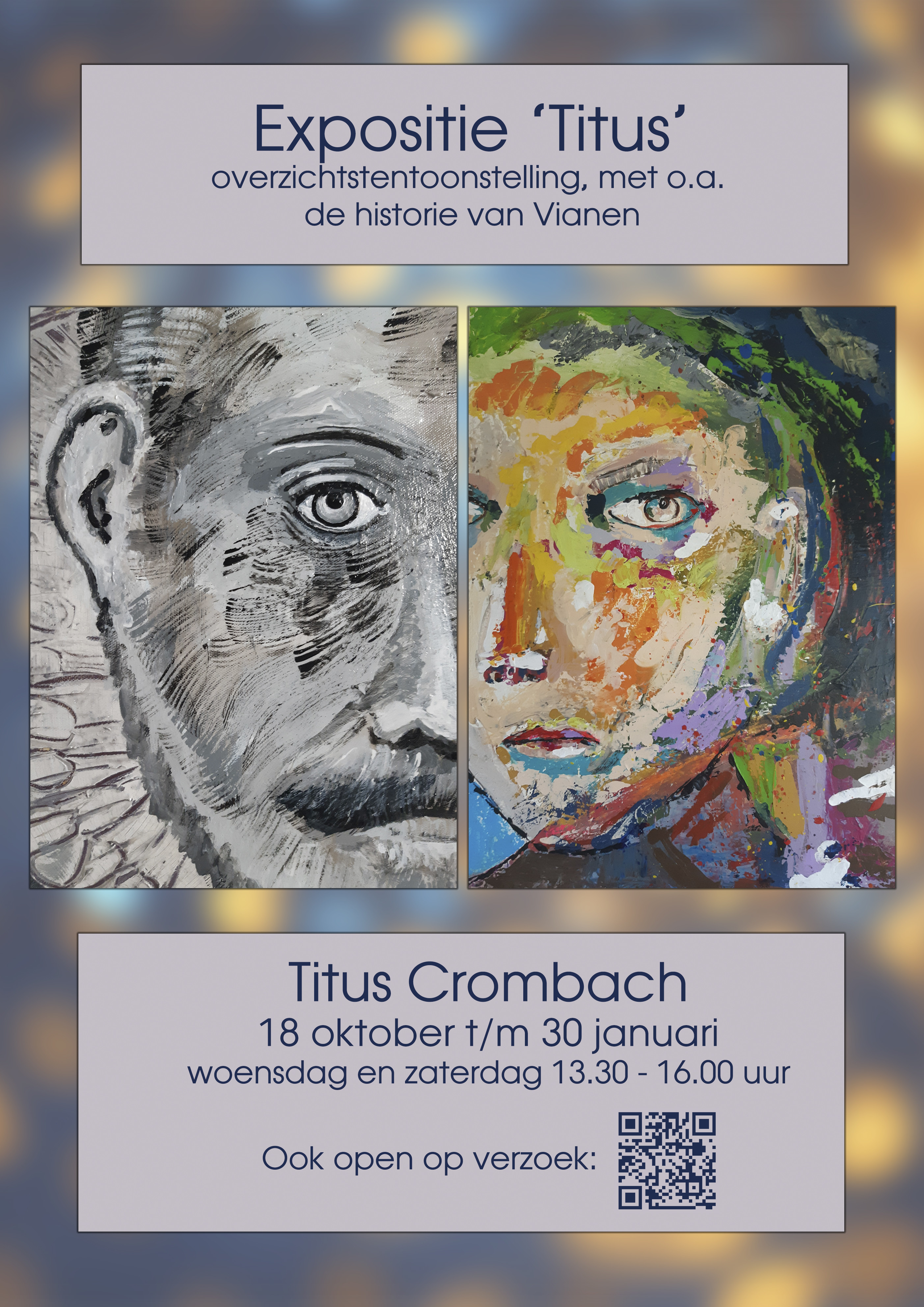 Overzichtstentoonstelling 'Titus' in de Grote Kerk te Vianen (Ut). Met o.a. de historie van Vianen, 2de WO verzetshelden uit Vianen, CoBrA stijl en oude meesters. Periode van 18 oktober 2025 t/m 30 januari 2026. Elke woensdag en zaterdag van 13.30 uur tot 16.00 uur geopend (toegang gratis). Verder ook op afspraak toegankelijk.