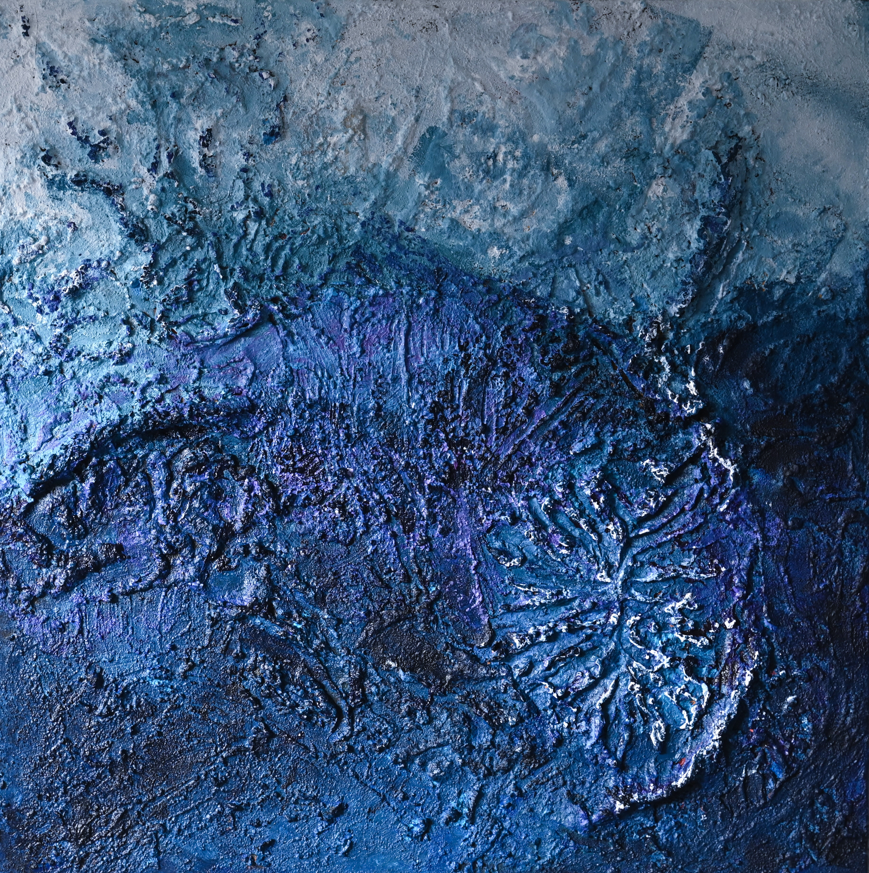 Een gelaagd abstract landschap van blauw en indigo, waar ruwe texturen en zilveren accenten samenkomen. Het schilderij ademt rust en mysterie, en nodigt uit om te verdwalen in de diepte tussen beweging en stilte.