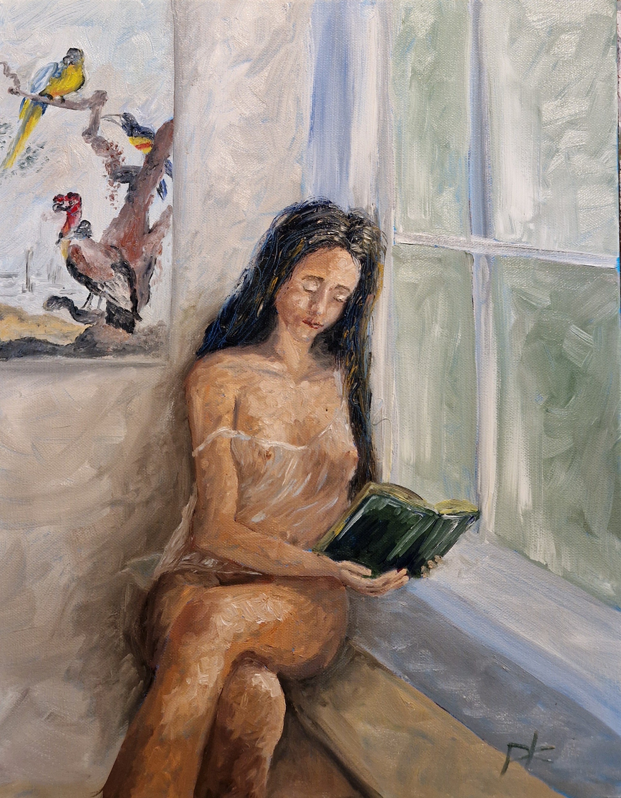 In dit beeld wordt het moment gevangen van ingetogen concentratie. De zittende jonge vrouw met een luchtig nachthemd aan is verdiept in een boek, afgewend van de buitenwereld maar badend in het koele daglicht dat door het raam naar binnen valt. Het licht modelleert het lichaam zacht en benadrukt de kwetsbaarheid en rust van het moment, zonder het intiem of anekdotisch te maken. Op de achtergrond hangt een schilderij van Aard (Aart) Schoumman met vogels, een bewuste kunsthistorische verwijzing. Dit beeld van de natuur — levendig, observerend en bijna speels — contrasteert met de stille, naar binnen gekeerde houding van de lezer. Zo ontstaat een gelaagd spel tussen kijken en lezen, natuur en cultuur, buiten en binnen. Met losse penseelstreken en een ingetogen kleurenpalet wordt het ogenblik van stilte gevangen, concentratie en innerlijk leven.