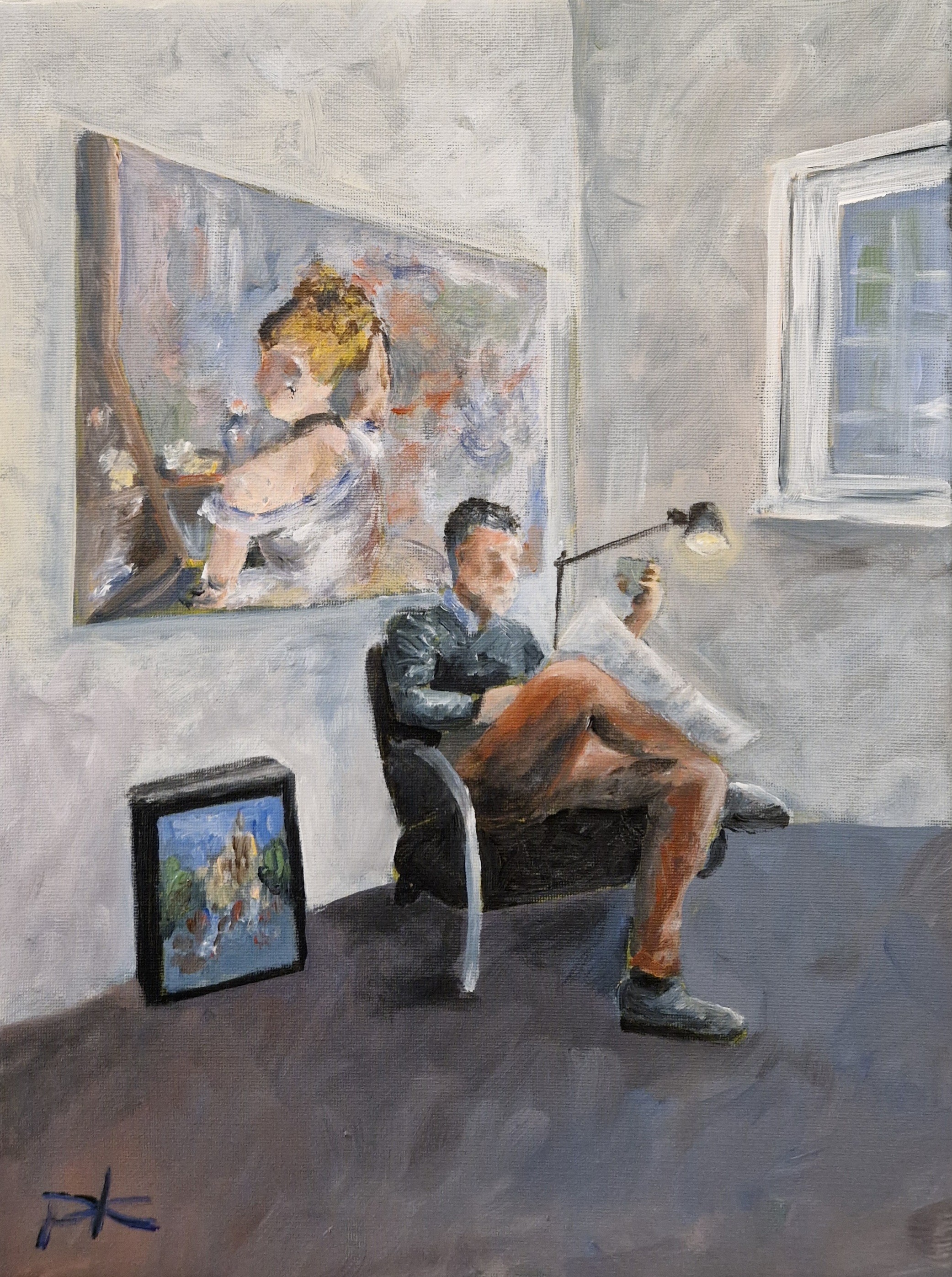 de ochtend krant lezen en genieten van een kopje koffie. met op de achtergrond het schilderij van Berthe Morisot (women at her toilet)