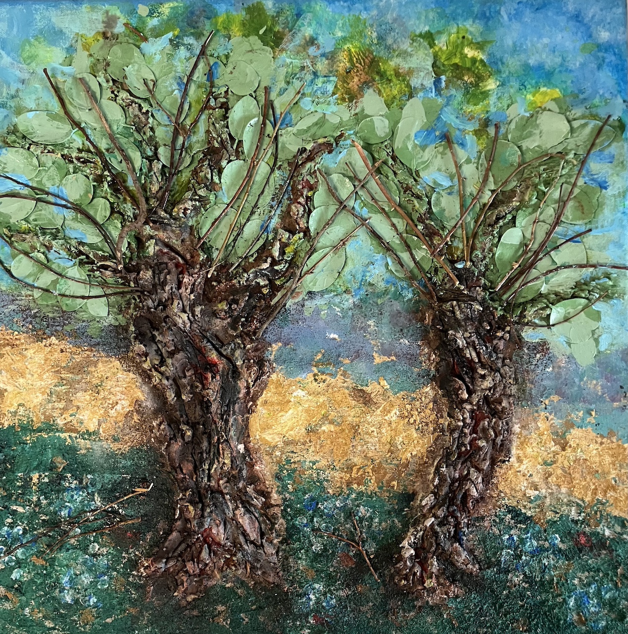 Deze wilgen staan voor de grilligheid van ons leven. De echte takken en blaadjes staan voor echtheid, realiteit.