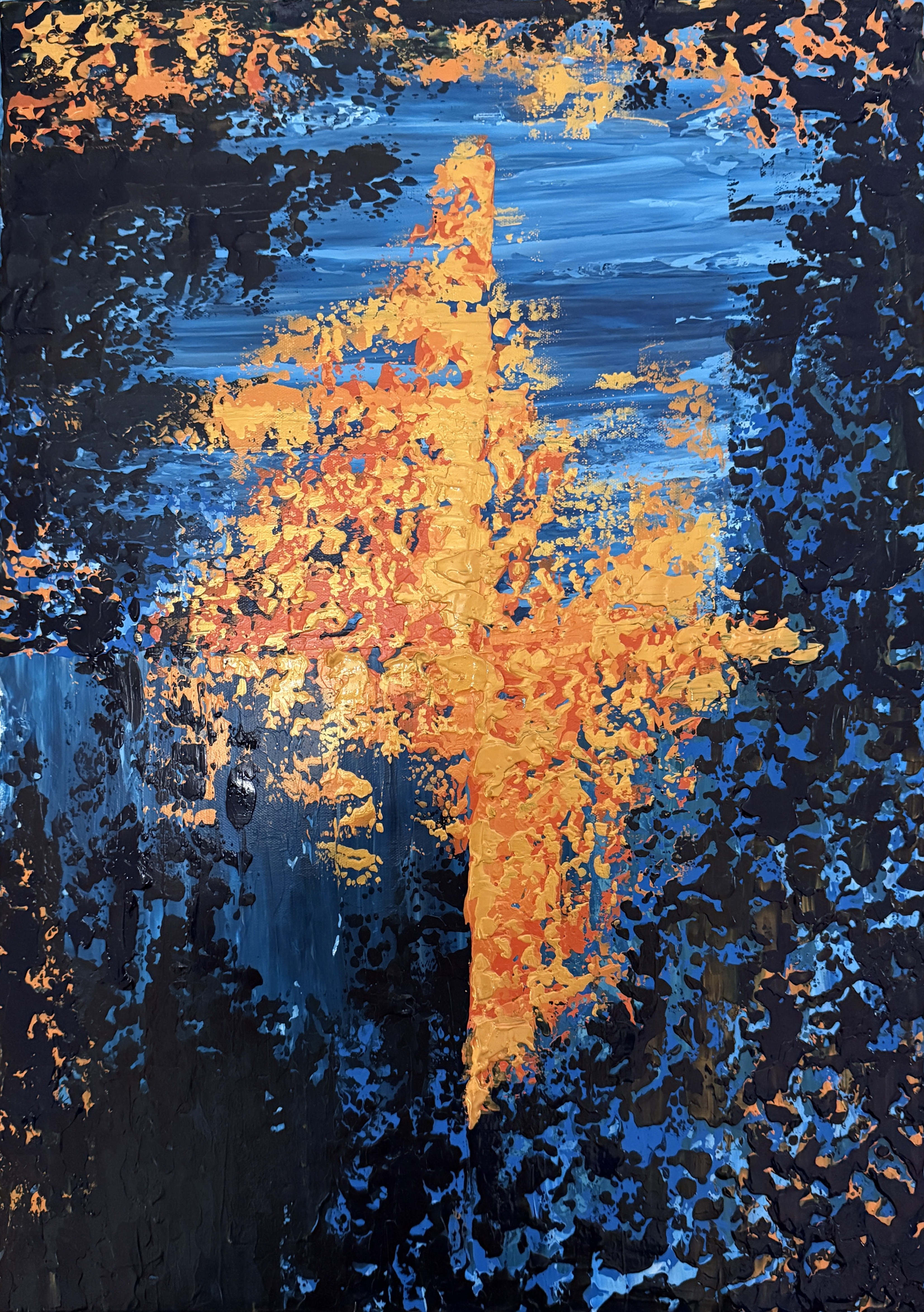Dit abstracte schilderij is geïnspireerd door een herinnering aan een opkomende supermaan boven de zee. Het licht van de maan dat weerkaatste op het water raakte mij door zijn intensiteit en symboliek. In plaats van herkenbare vormen heb ik gekozen voor een vrije, intuïtieve benadering. Door de vormen los te laten, ontstaat ruimte voor gevoel en interpretatie — een visuele vertaling van een moment dat zowel groots als persoonlijk aanvoelt.