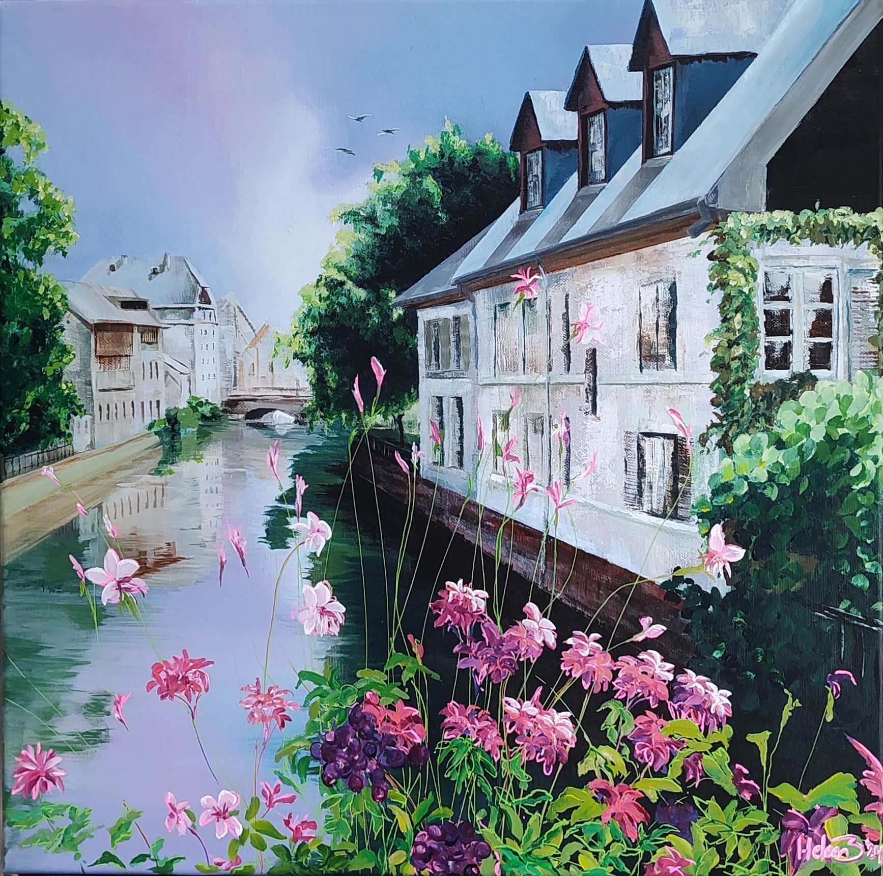 Vanaf de brug staar ik half dromend naar het water... tussen de weelderige bloeiende bloemen.. Het water weerspiegelt mijn gedachten. Het is een mooie dag. Herinnering aan Strassbourg Frankrijk 50x50cm op Canvas