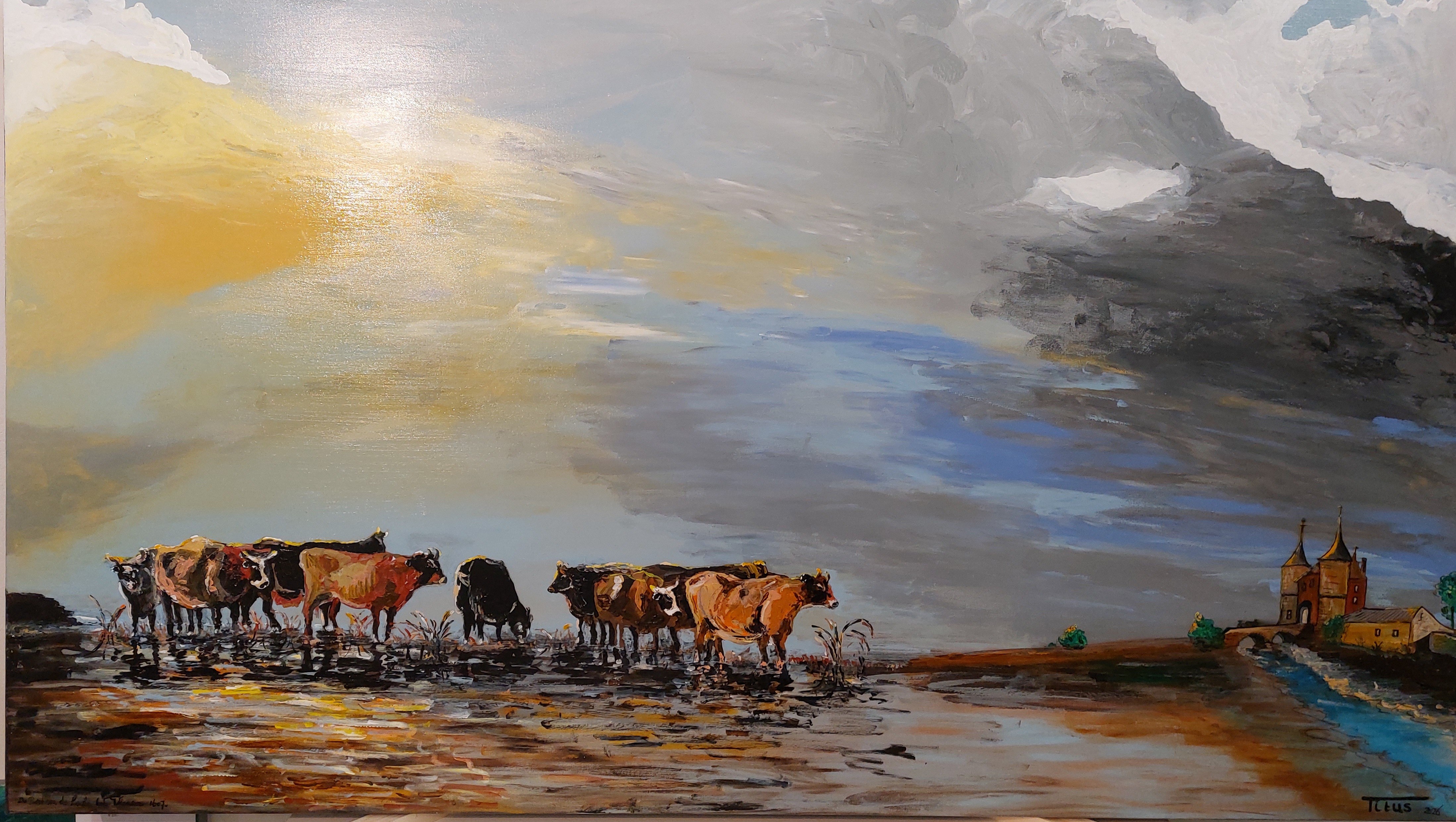 17de eeuws tafereel van runderen in de uiterwaarden van de rivier de Lek tijdens zonsopkomst. U kijkt van noord-west naar zuid-oost met in de verte zicht op de Vrijstad Vianen met "De poort na de Lek tot Vianen" inclusief de twee toenmalige voortorens. Doek is vrij fors en alleen bedoeld voor speciale gelegenheden in de regio Vianen (Ut). Het doek is gereed. Op woensdag 14 januari 2026 is een korte impressie (You Tube short) gemaakt. https://youtube.com/shorts/Bt37JjivOTo?si=FSg7h2jZUG0Piz6T