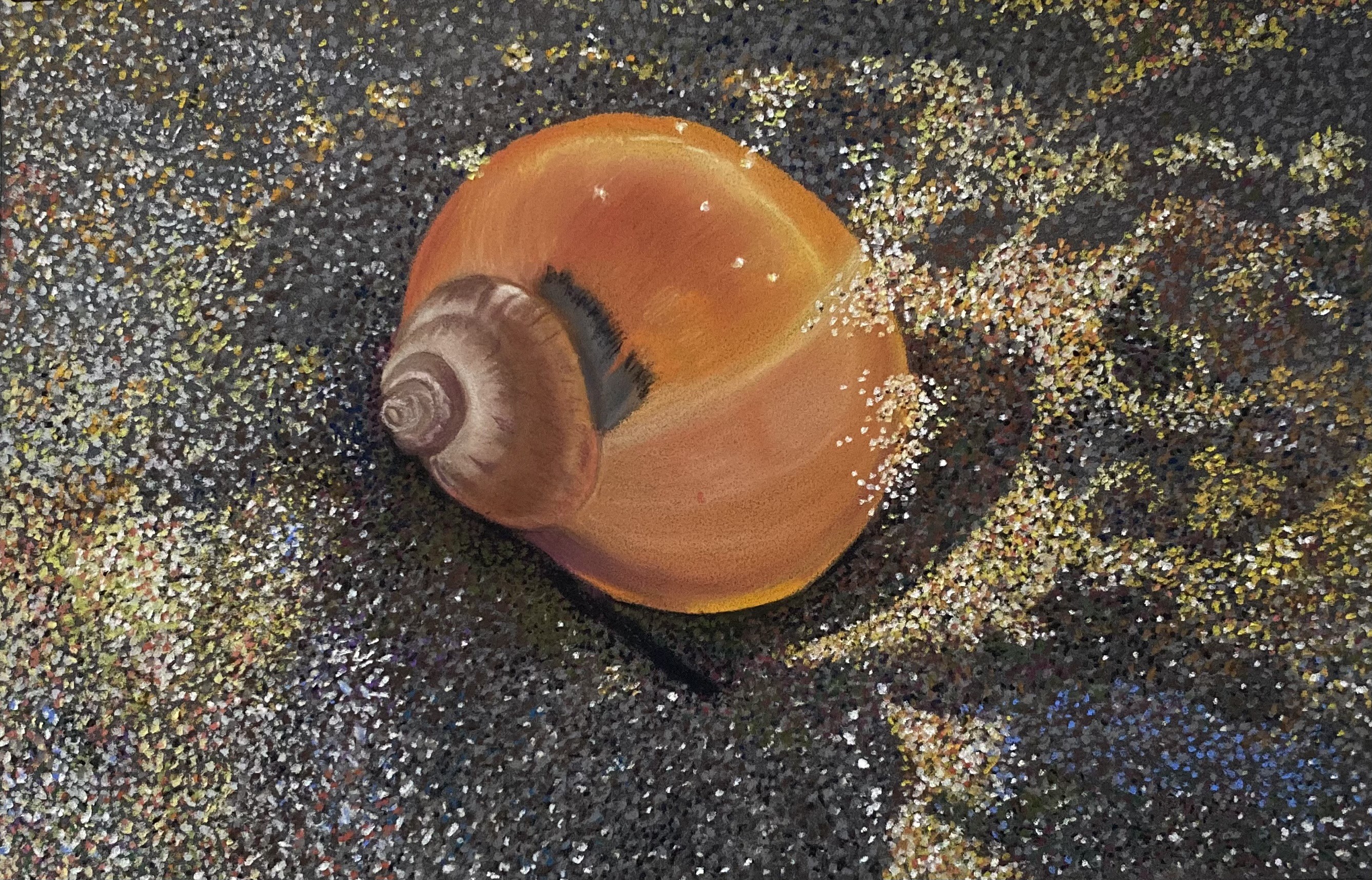 Deze schelp lag op het strand in de ondergaande zon. Daardoor kwam er een mooie oranje glans op de schelp.