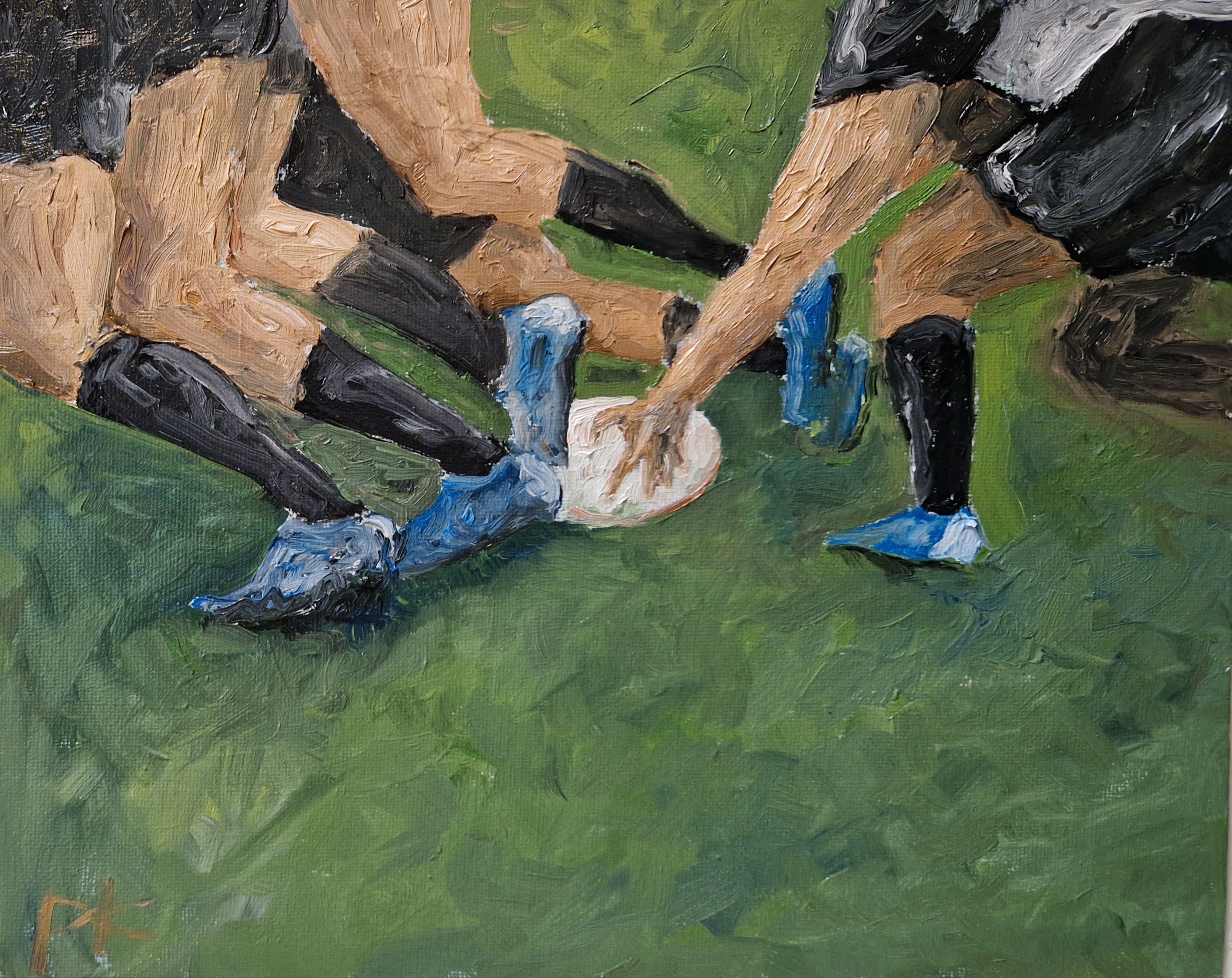 In Scrum vang ik het dynamische, bijna dansante moment van hervatting in het rugby – een spel dat draait om kracht, strategie en onverwachte wendingen. De scrum, een symbool van hergroepering na een overtreding, is hier niet alleen een fysieke confrontatie, maar ook een metafoor voor het leven zelf: hoe we, na een struikelblok, opnieuw onze balans zoeken en samen verder gaan. De expressieve penseelstreken en het levendige kleurenpalet – van het felle groen van het veld tot de aardse tonen van de spelers – benadrukken de intensiteit en de energie van dit beslissende moment. De abstracte vormgeving nodigt de kijker uit om niet alleen de actie, maar ook de emotie achter de sport te ervaren: de spanning, de vastberadenheid, en de ongeschreven regels van respect en teamwork.