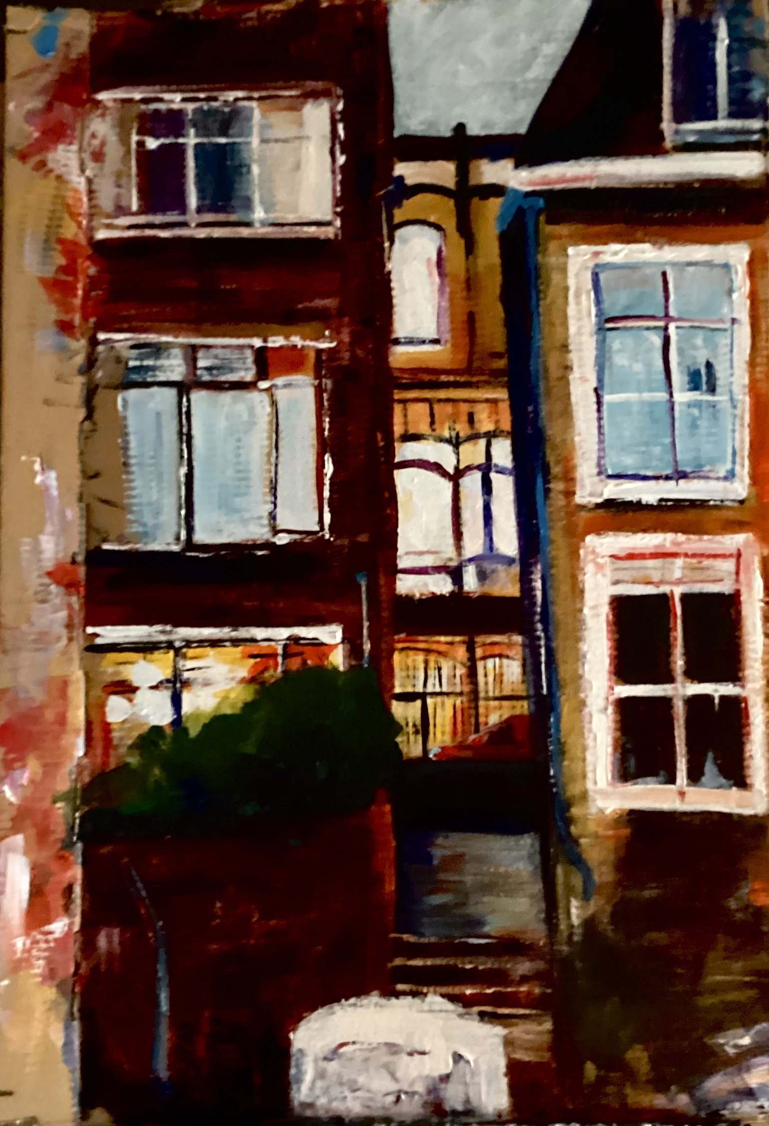 Snel op karton met mes, kwast en doekjes sfeervolle grachtenpanden en stegen schilderen