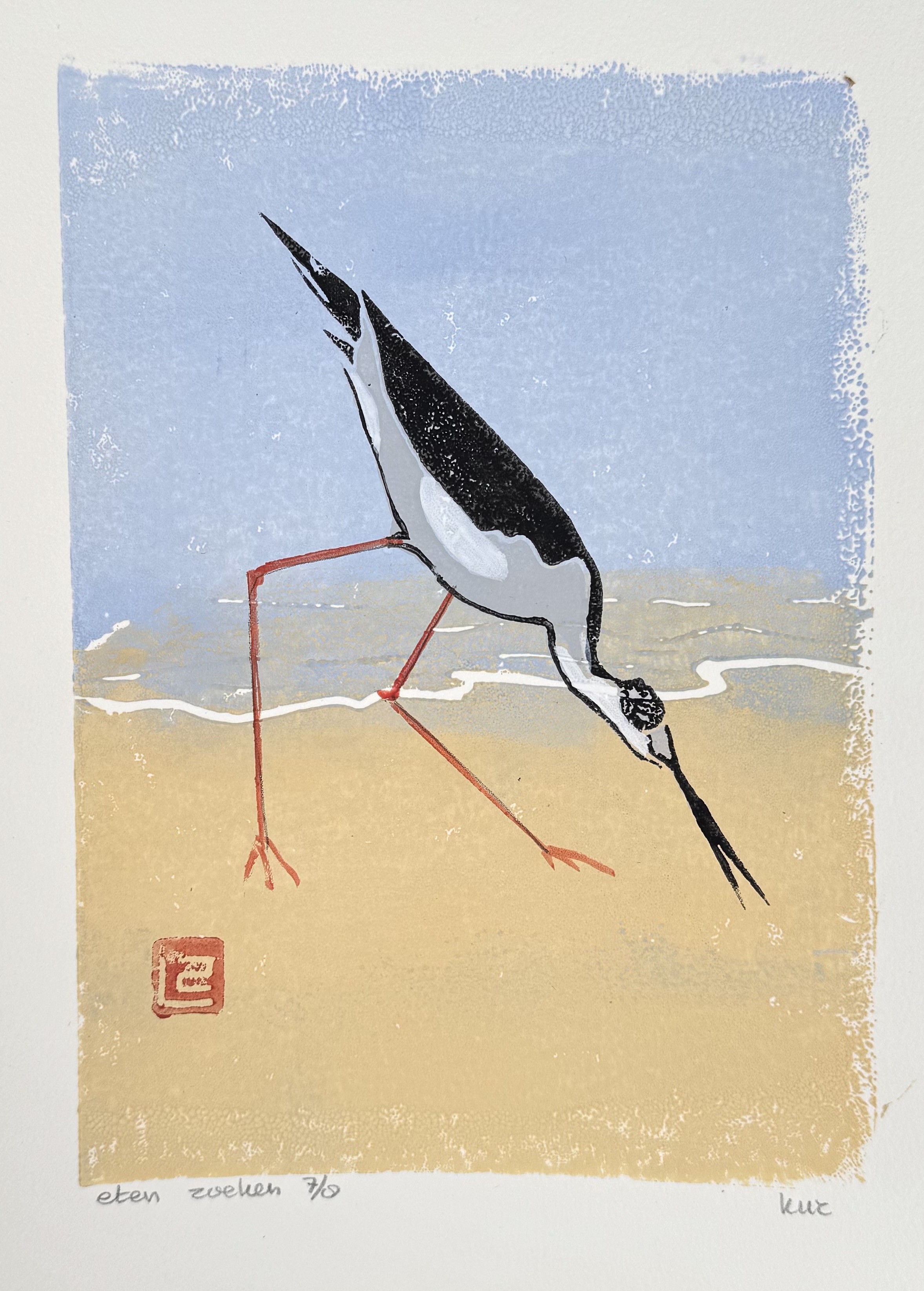 Deze steltkluut is opzoek naar zijn eten. Linodruk reductionprint. 4 lagen