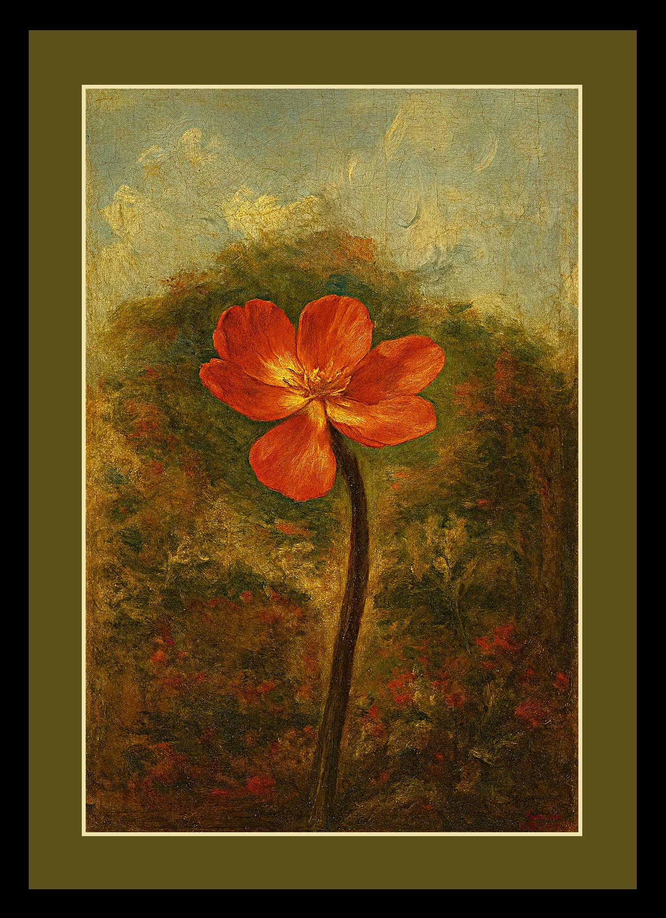 In deze barokke interpretatie staat een enkele rode bloem centraal - niet als decoratief motief, maar als een verstilde aanwezigheid. Haar vijf bloemblaadjes, warmrood en licht gekreukt, openen zich naar het licht, terwijl de gele kern gloeit als een innerlijk vuur. De steel, donker en gebogen, draagt haar met ingetogen kracht. De achtergrond is een droomlandschap van flora en lucht: zachte wolken zweven boven een veld van kleurige bloemen en bladeren, geschilderd in Ruysch´s kenmerkende stijl - botanisch nauwkeurig, maar nooit stijf. Elk blad, elke schaduw draagt een echo van vergankelijkheid en schoonheid. Deze bloem is geen symbool van pracht, maar van aandacht. Ze vraagt geen bewondering, maar verstilling. In haar eenzaamheid en helderheid herinnert ze ons aan het moment waarop de natuur niet overweldigt, maar fluistert.