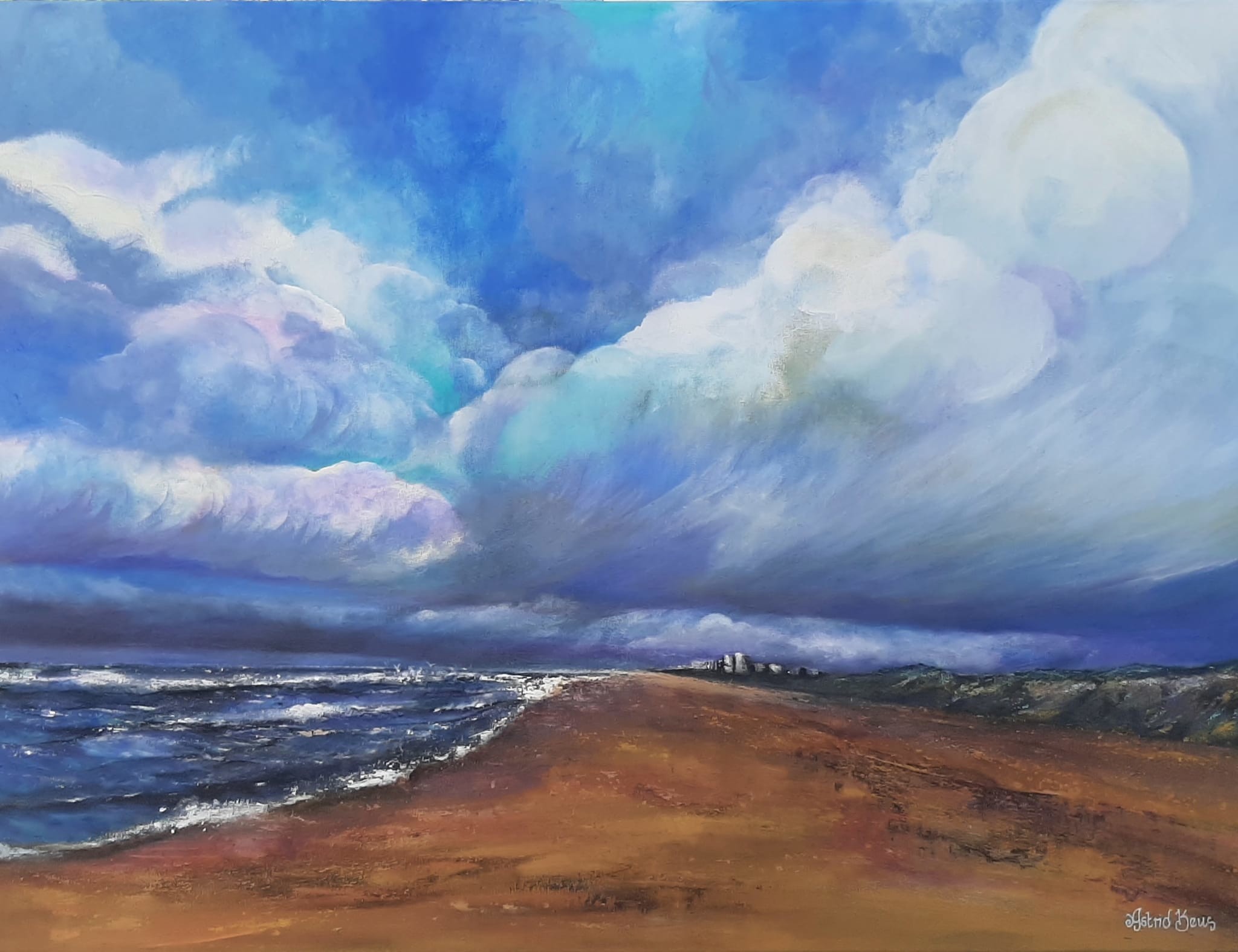 We liepen op een stormachtige dag van Katwijk naar Noordwijk. De lucht was geweldig dreigend en de wind etste tegen het zand. Ik kon het niet laten er een schilderij van te maken.