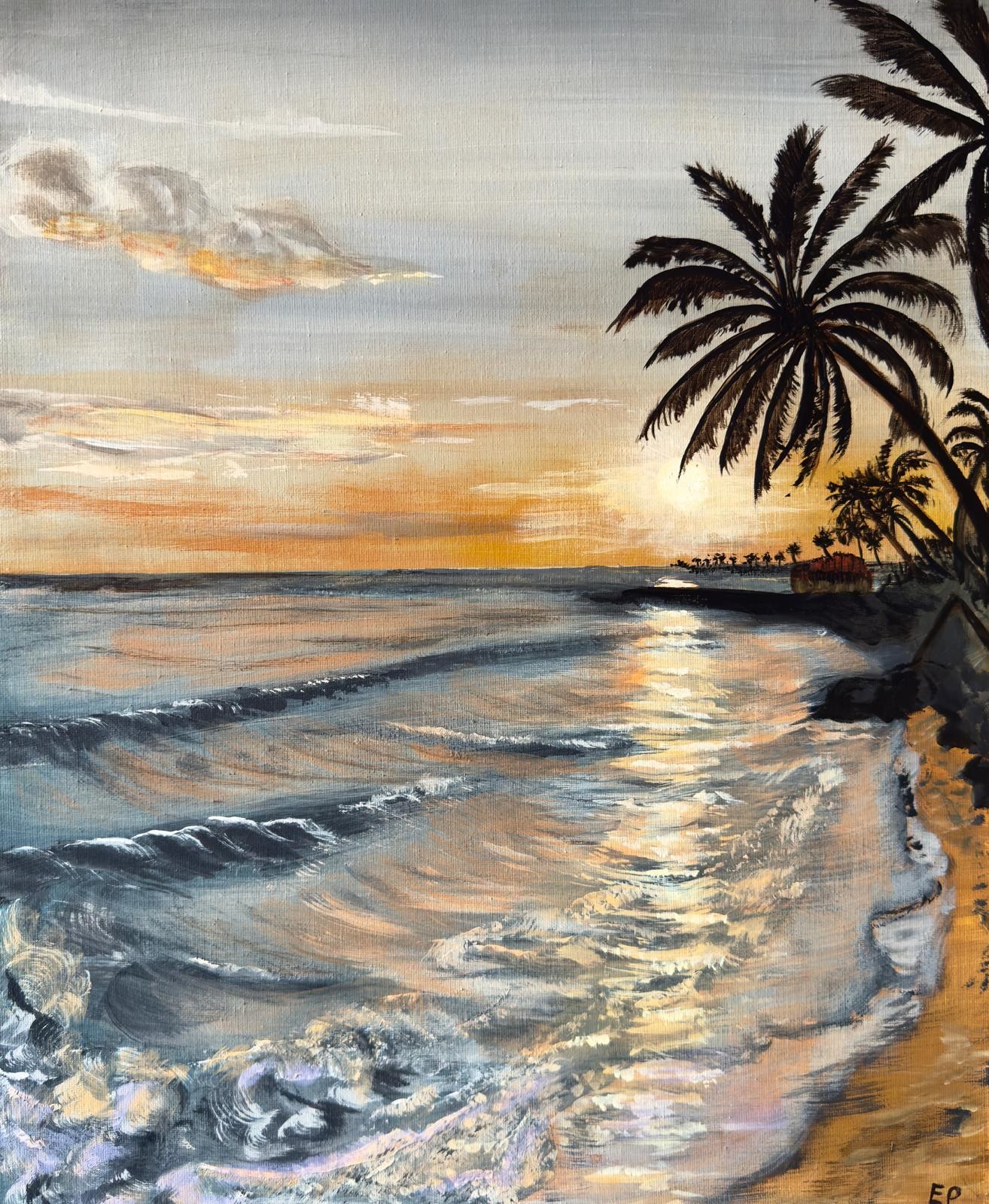 Dit schilderij is geïnspireerd door de kust van Spanje. Het avondlicht, de palmbomen en de zon die laag boven de zee staat vormen de basis van het werk. De nadruk ligt op lichtval, reflectie en beweging in het water. Typische elementen uit het mediterrane landschap zijn terug te zien in kleur en compositie. Geschilderd door Erik Pieke Onderdeel van Partners Art