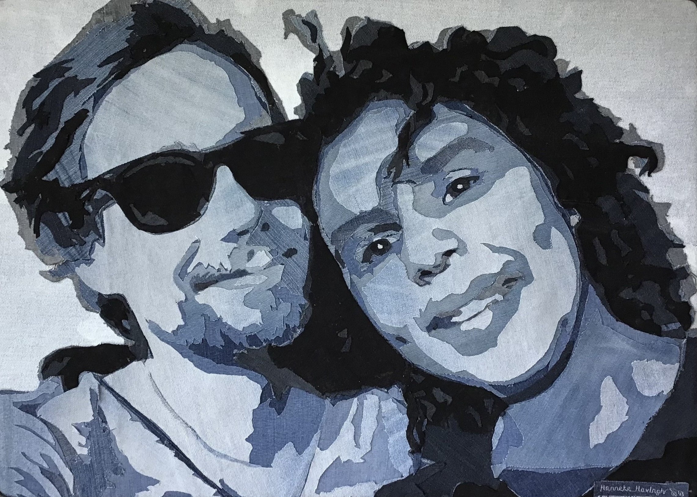 Natuurlijk heb ik ook portretten gemaakt van voor mij zeer dierbare personen. Ze gaven mij een foto waarvan ik dit denim portret gemaakt heb. 8 verschillende lagen denim van even hzoveel gerecyclede jeans is hierin verwerkt. De lichtval is belangrijk in een portret te verwerken maar de beperktheid van de beschikbare jeans maakt het soms wat lastig.