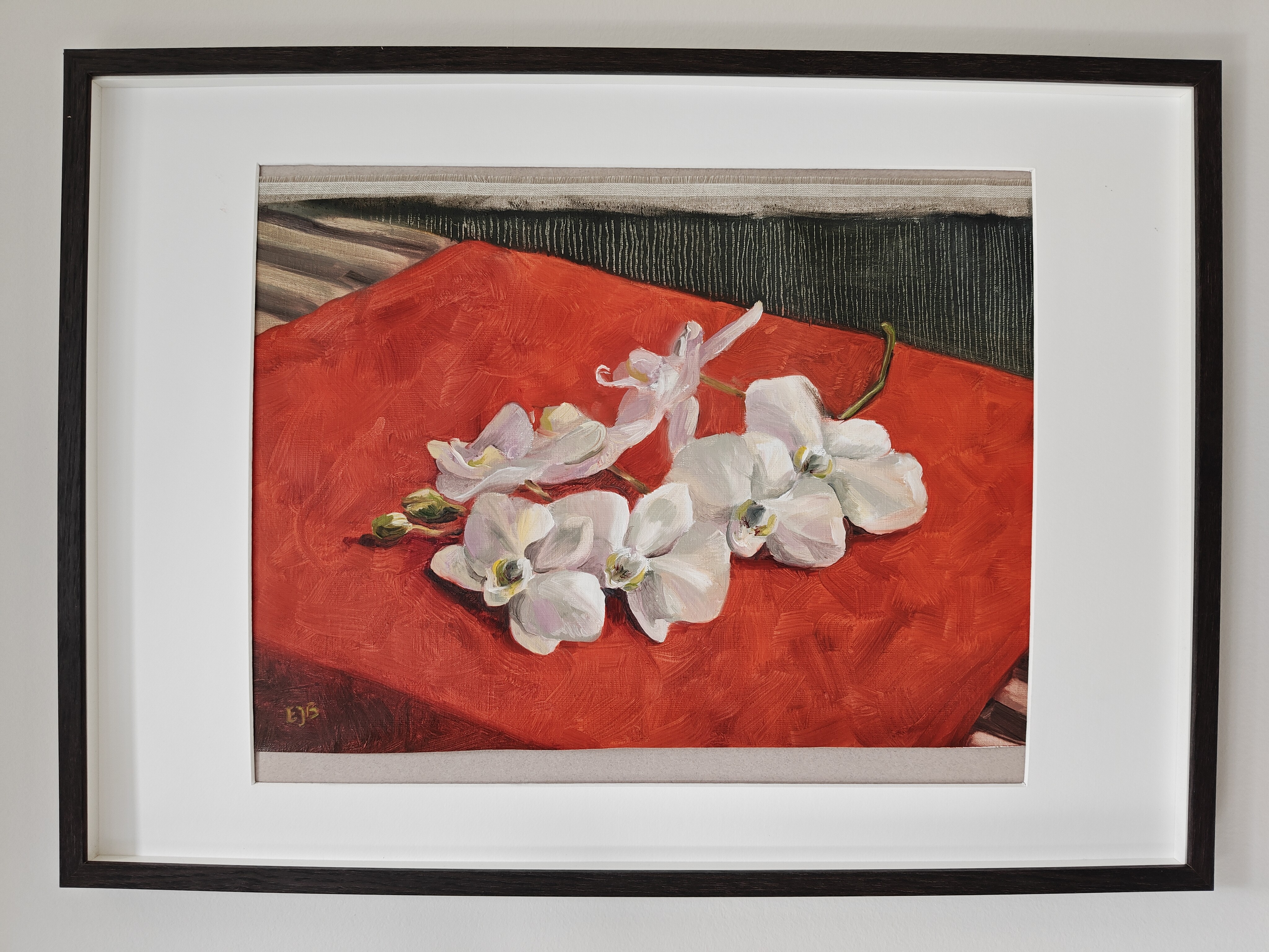Bij de voorbereiding van de opstelling voor dit schilderij, brak per ongeluk een tak vol bloemen af. Dus heb ik die dan maar vereeuwigd in dit schilderij.