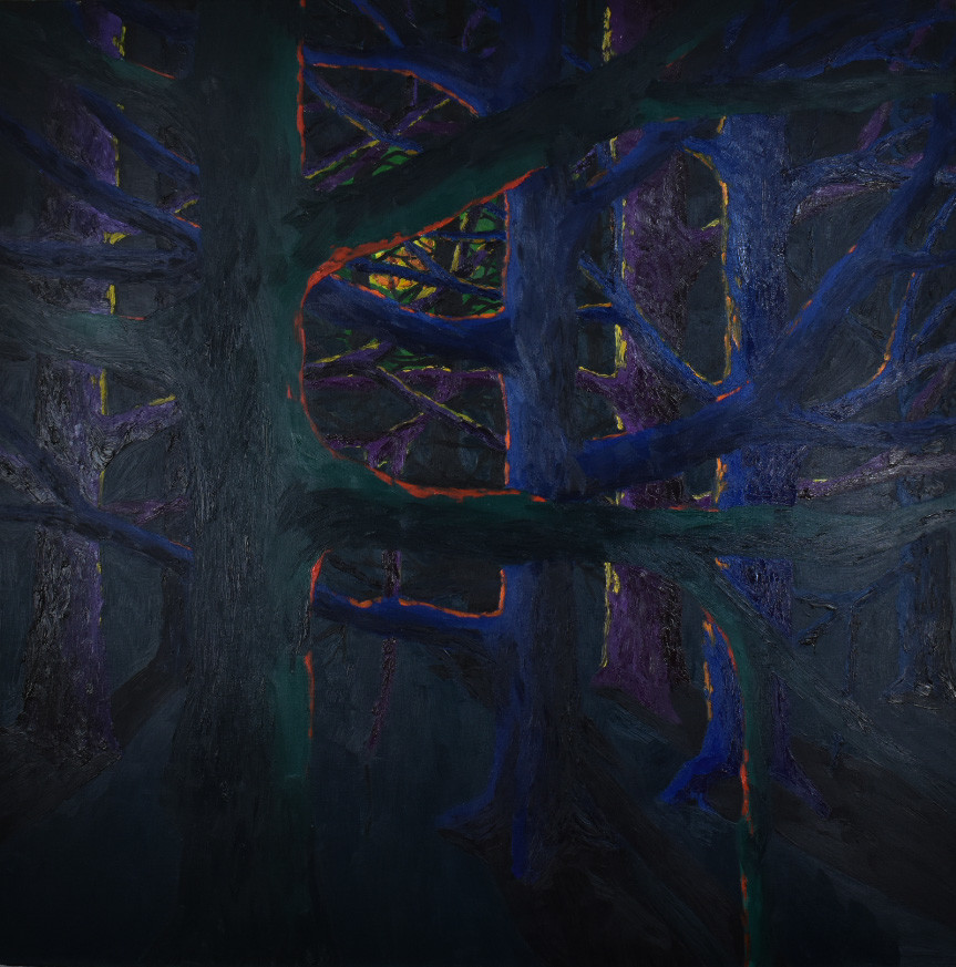 Semi abstract landschapschilderij van een moeilijk doordringbaar bos, met in de verte een lichtbron