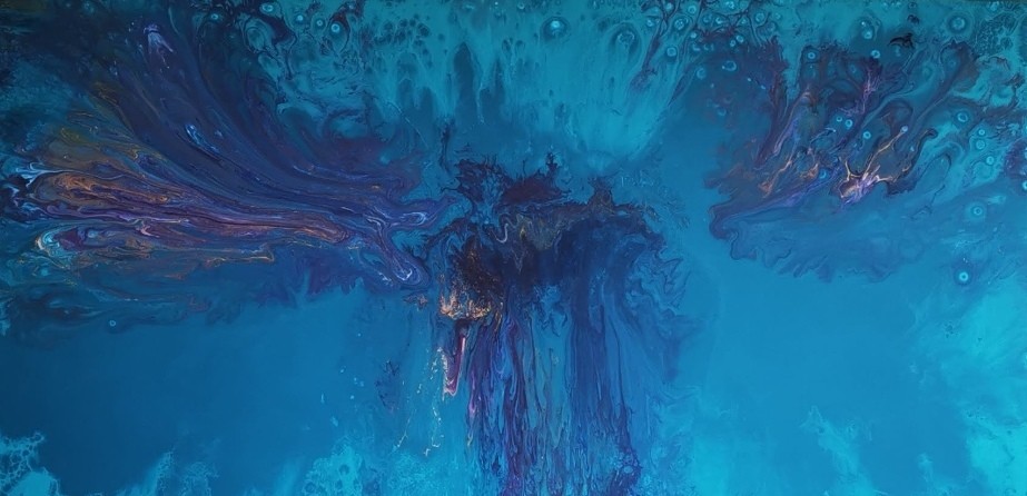 Dit werk is gemaakt op een doek van 2 x 1 meter met de pouring paint techniek. Vormen ontstaan door acrylverf te verdunnen met een medium en water en met gebruik van een föhn uiteen te blazen. Het is verkocht
