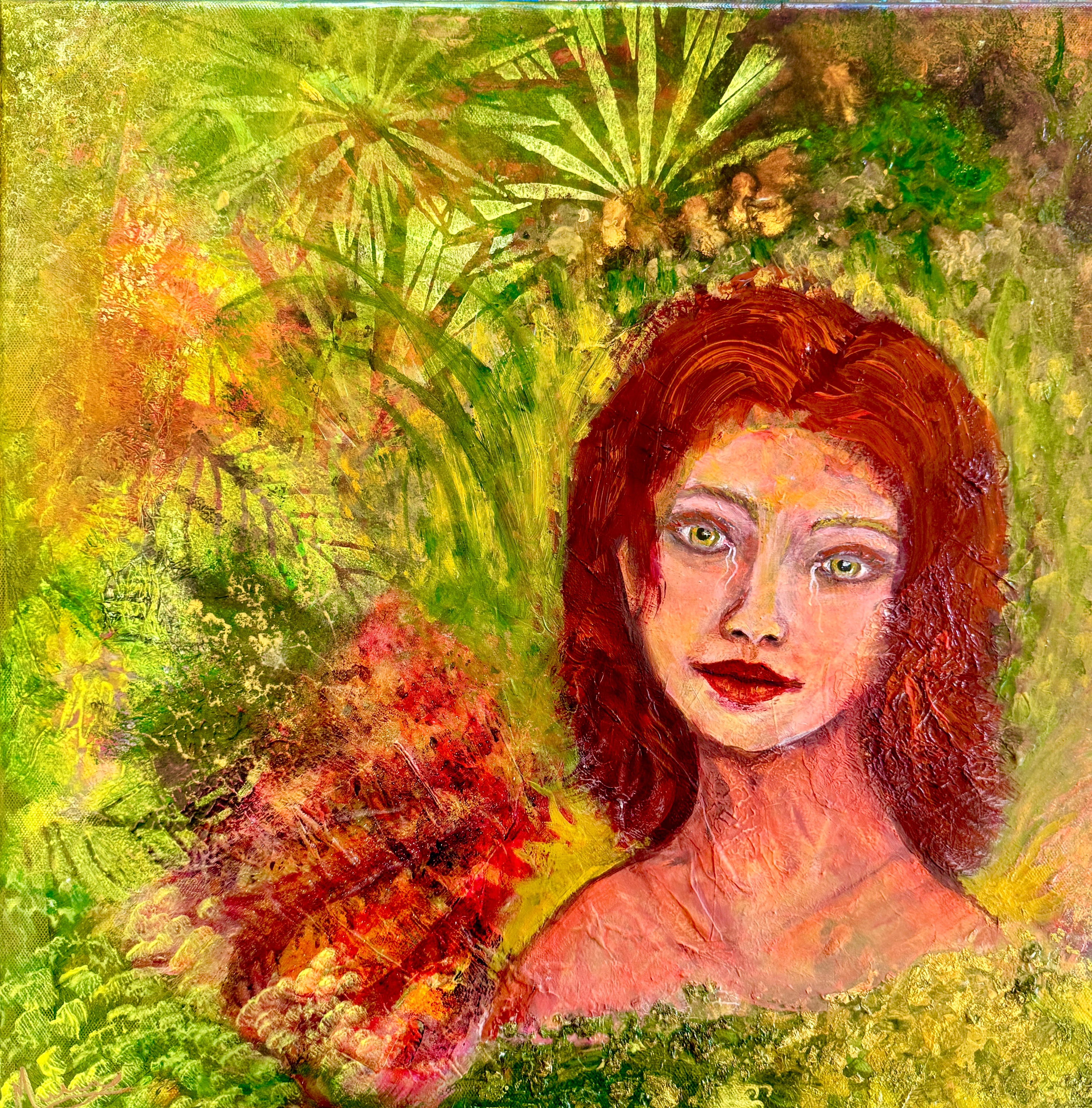 in shades of green and gold,