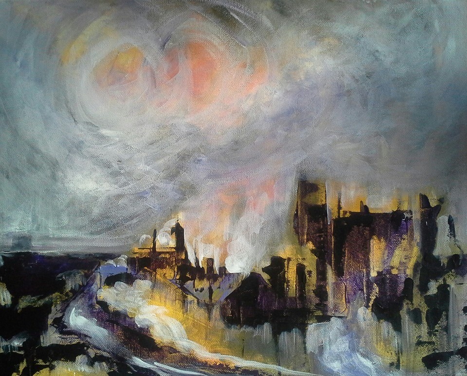 Een schilderij met de herinnering van een mijnstad waarin ik gewoond hebt.