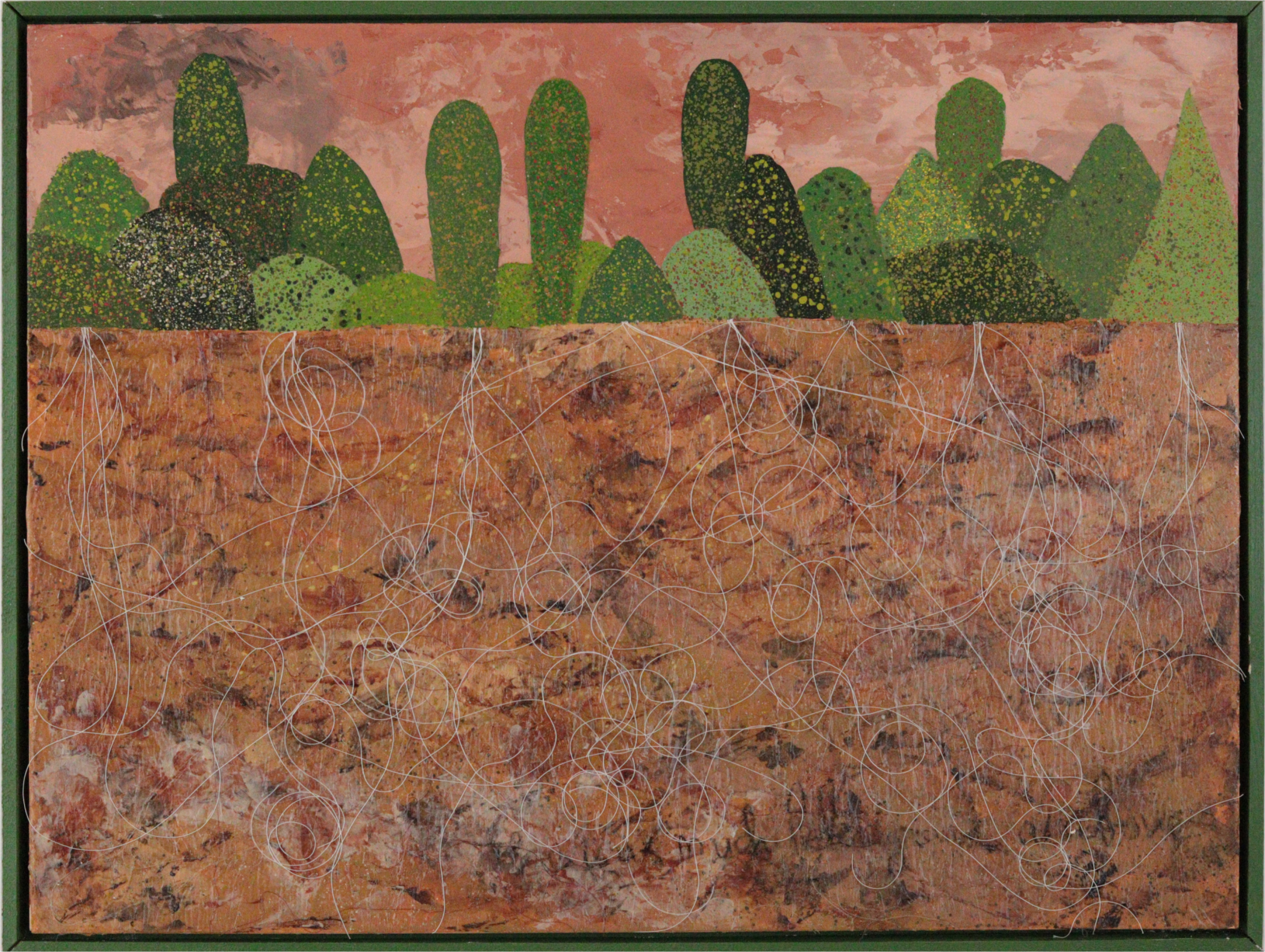 Een groene bosrand met daaronder zichtbaar in de bodem de microscopische netwerken van wortels die de bomen met elkaar verbinden.