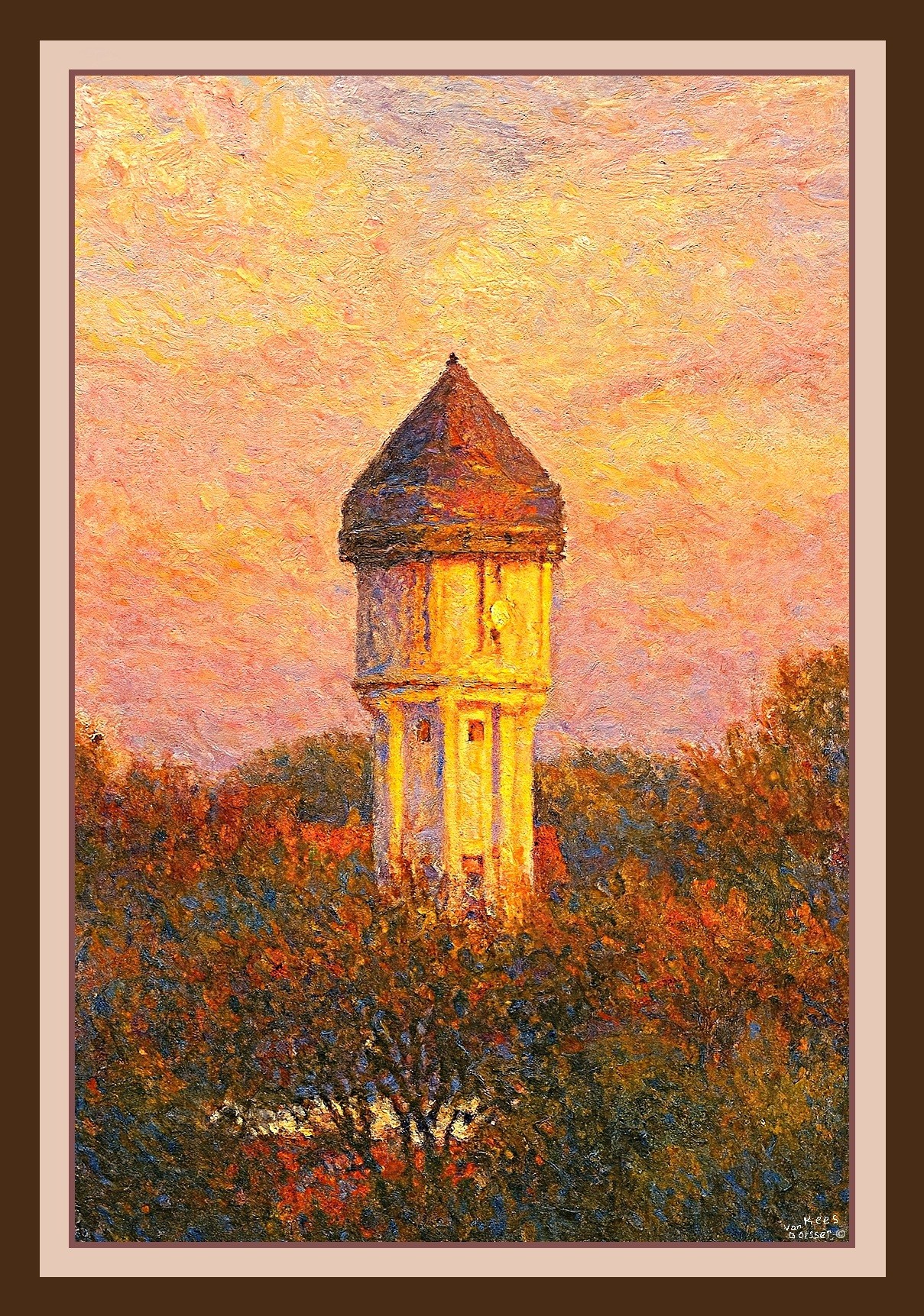 De witte toren staat als een wachter boven het bladerdak, haar dak donker en spits, haar venster een zon die nog niet onder is. Delucht is een mengsel van roze, oranje en violet-alsof de dag zich uitstrekt in penseelstreken. De bomen onderaan zijn warm van kleur, als een tapijt van nazomer.