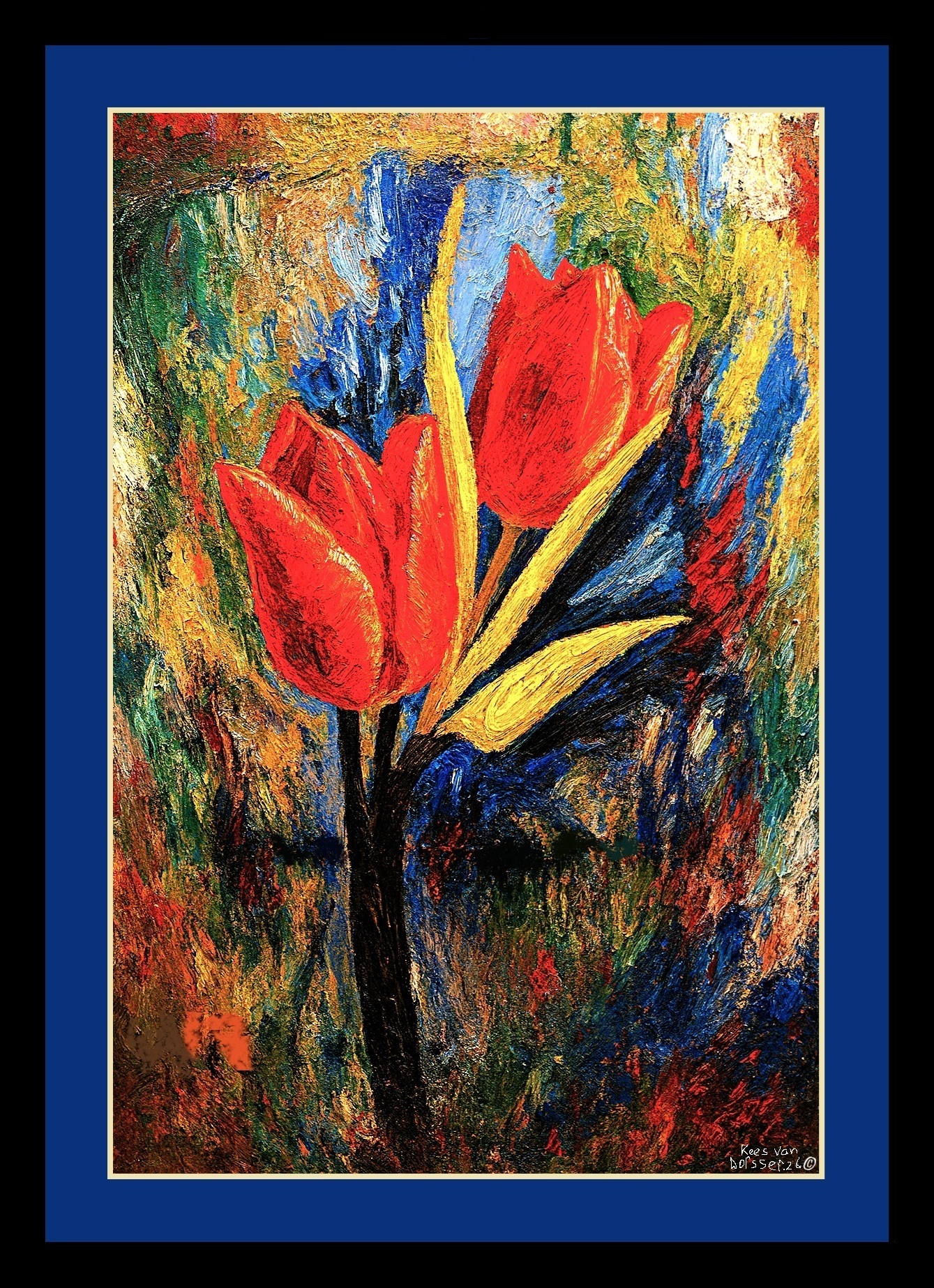In Tulpenstorm ontvouwt zich een explosie van kleur en beweging. Drie vurige tulpen rijzen op uit een abstracte achtergrond die pulseert van leven-een werveling van blauw, groen, geel, rood en wit. De bloemen zijn niet slechts vormen, maar symbolen van kracht, kwetsbaarheid en groei, terwijl de gele bladeren als bliksemschichten door het doek snijden.