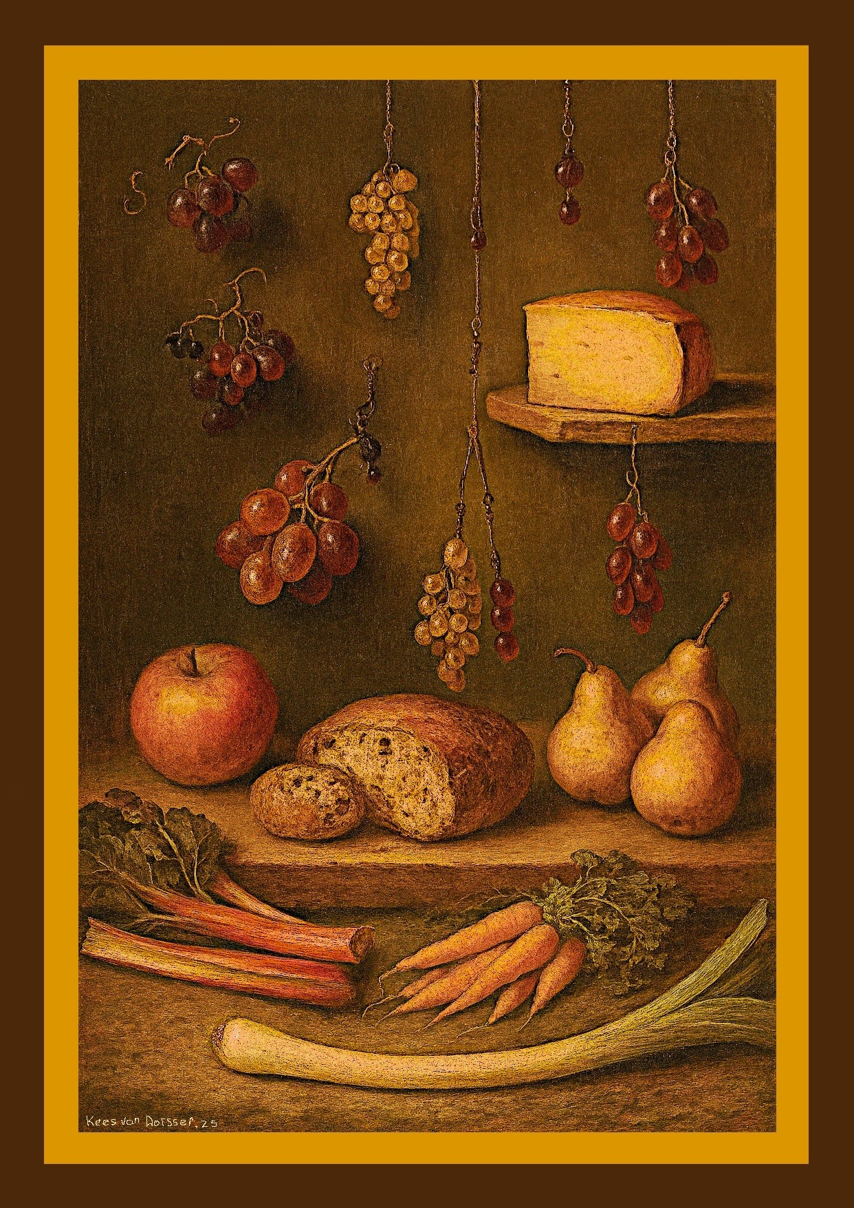 _In het zachte licht van de late middag hangen druiven als juwelen aan ketting en tak. De kaas rust op de plank, het brood is aangesneden-een moment tussen honger en herinnering. Appel, peren, wortel en prei liggen als stemmen van het land, rabarber als echo van zuur en zoet. Dit is geen maaltijd, maar een stille getuigenis van wat groeit, wat blijft, en wat verdwijnt._