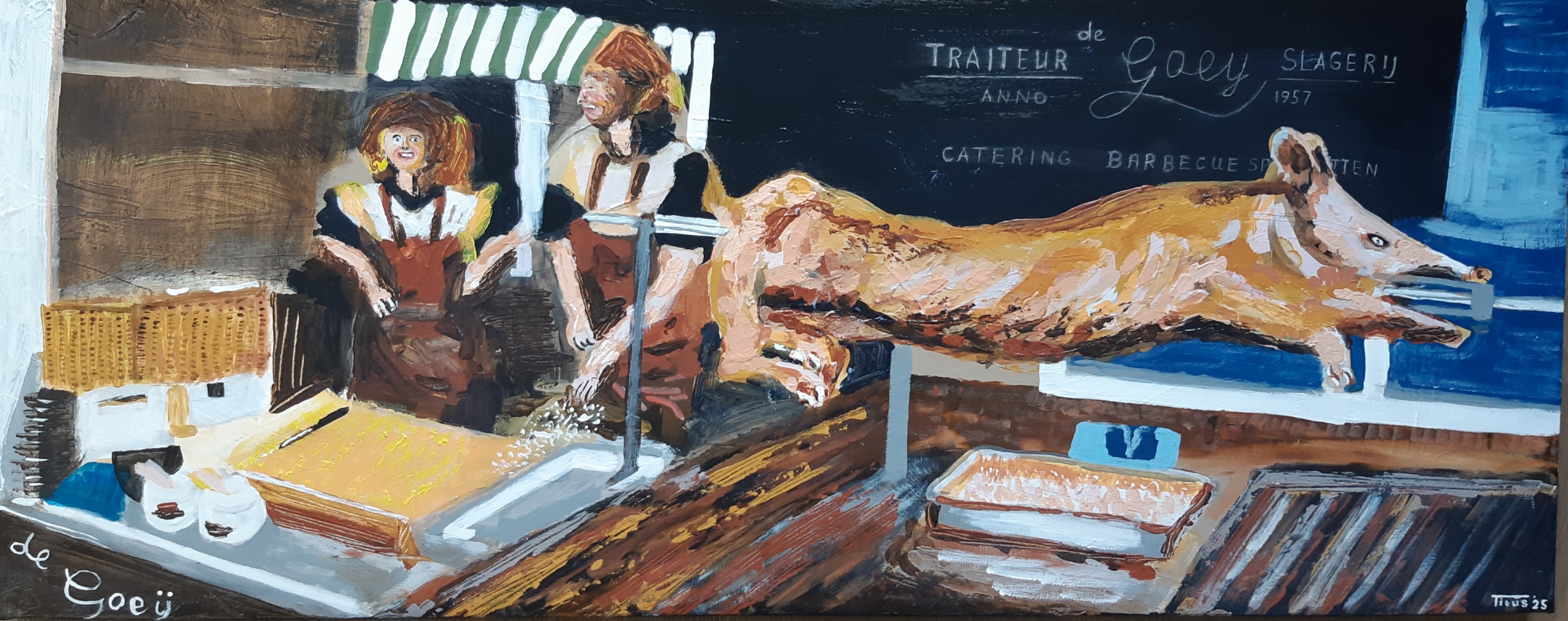 Traiteurslagerij De Goeij tijdens de toneelroute (herbegrafenis van Walraven III) te Vianen in 2016. Naïef impressionistisch.