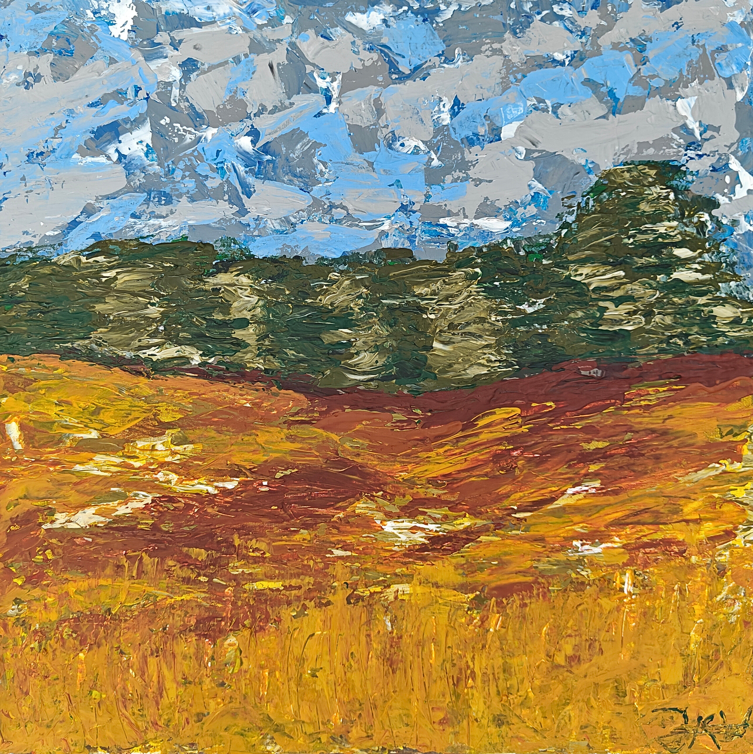 Wolken vagen weg terwijl de wind wappert door de bomen. Dor gras reflecteert het contrast van de beweging van het bos. Een dynamisch spel van kleur en beweging.