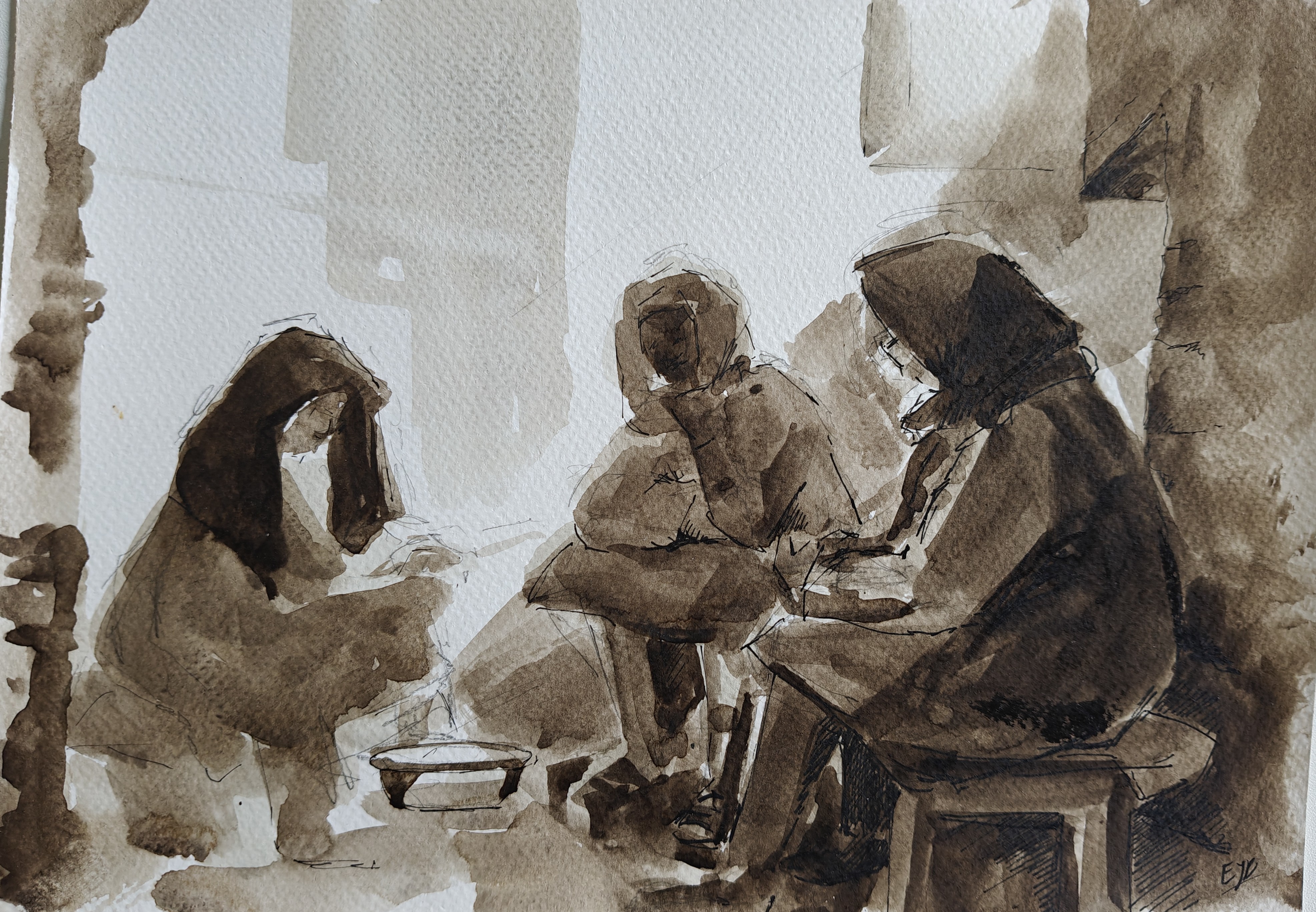 Deze vrouwen in Bhalil heb ik even mogen vergezellen om deze tekening te maken. De vrouw rechts is kleine knoopjes van touw aan het maken die gebruikt worden voor traditionele Marokkaanse kleding. De andere twee links waren het eten aan het voor de avond. Hoe mooi is het dat kunst ontwapenend werkt en helpt om verbindingen met andere mensen aan te gaan, ook al spreek je niet elkaars taal.