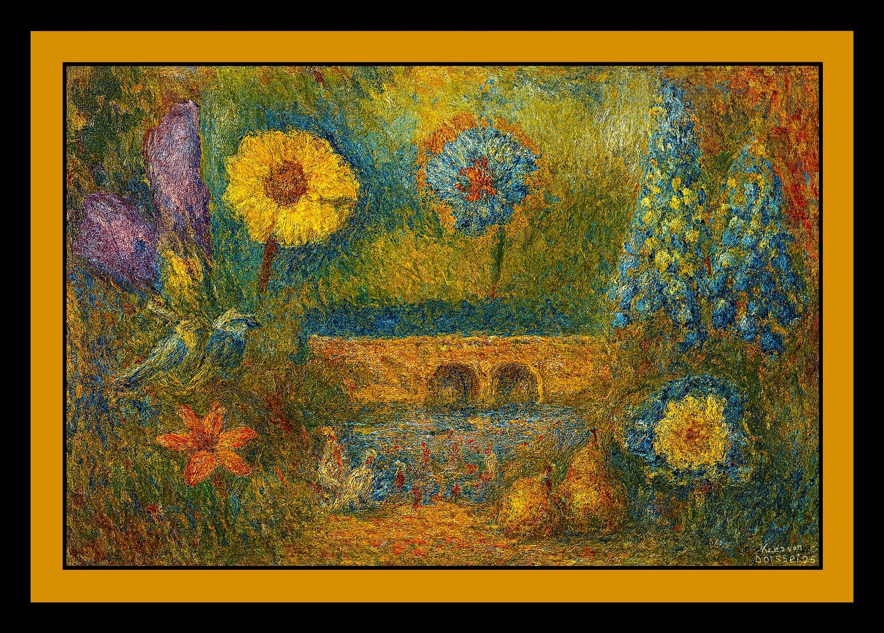 _Twee duiven, tien bloemen, één Brug. De lucht ruikt naar belofte, de stenen naar herinnering. Hier bloeit geen tuin, maar een ontmoeting - tussen kleur en stilte, tussen vleugel en wortel, tussen wat was en blijft._