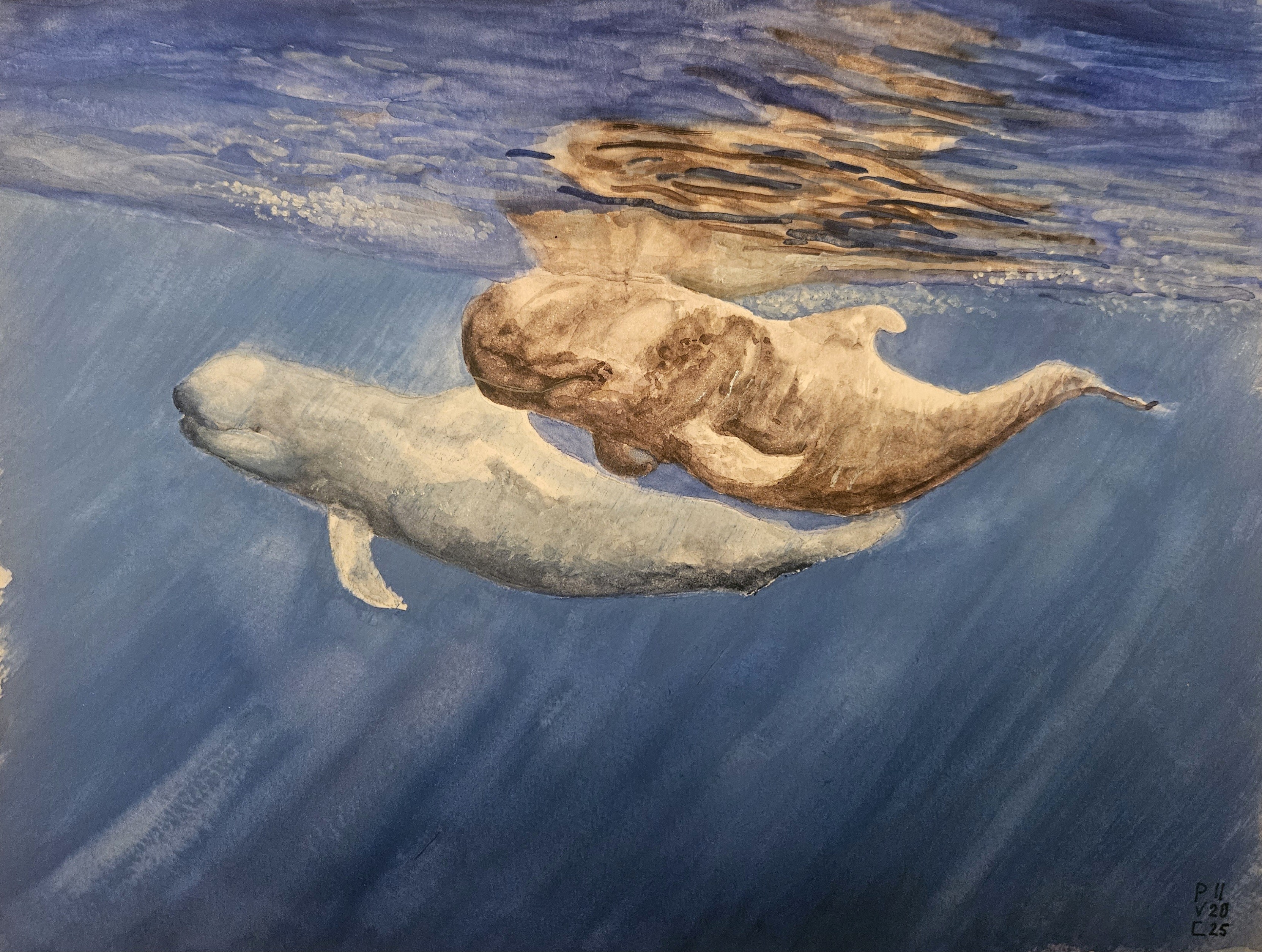 In Nieuw Zeeland zagen we op de boot geen walvissen. Dus nog een keer proberen in Tenerife. Hier zagen ze wel voorbij komen. En nogmaals een schilderij van onder water gemaakt. Het zijn grienden.
