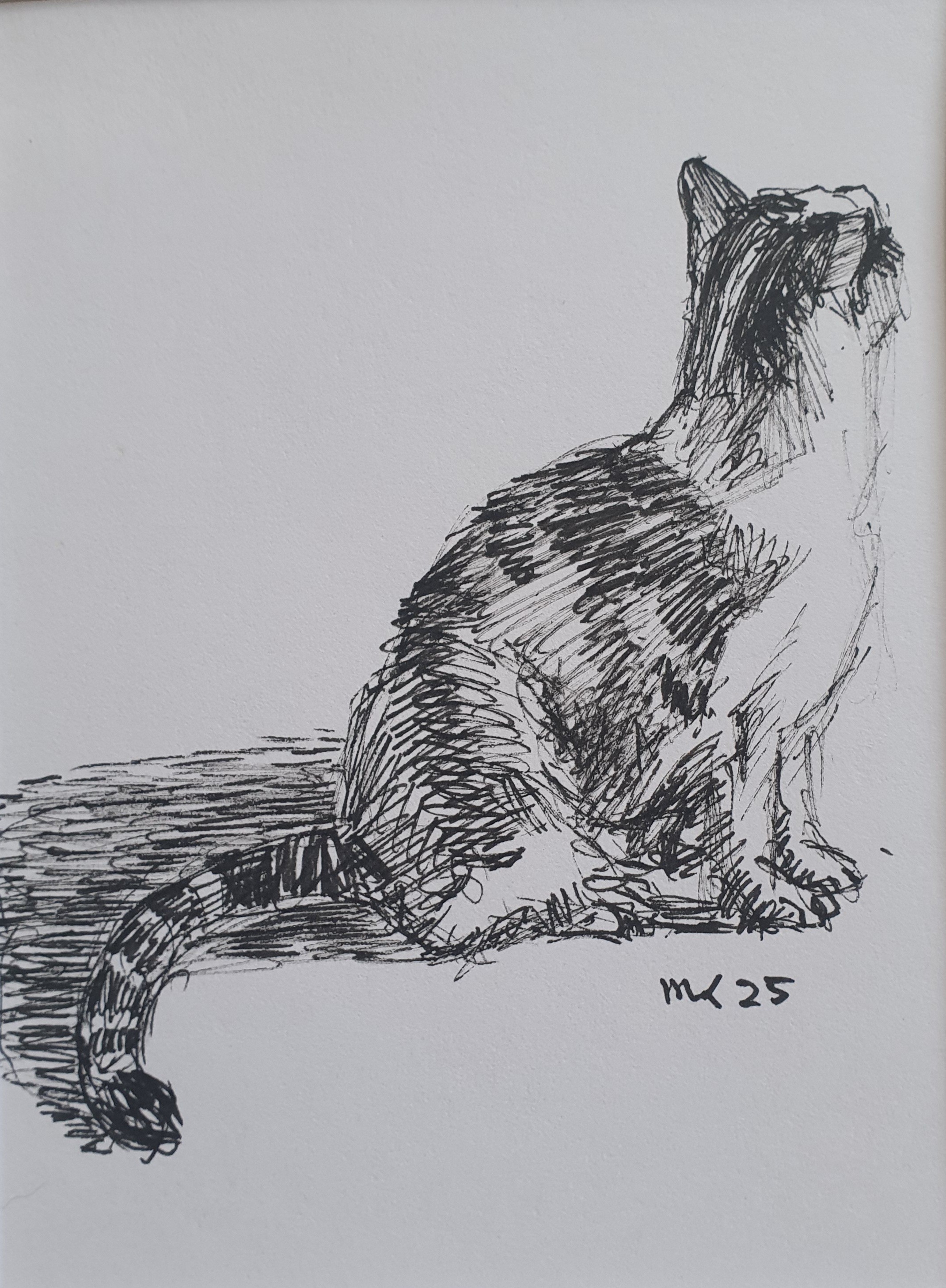 Kat die haar kopje opricht om te zien wat er gebeurt, in fineliner.